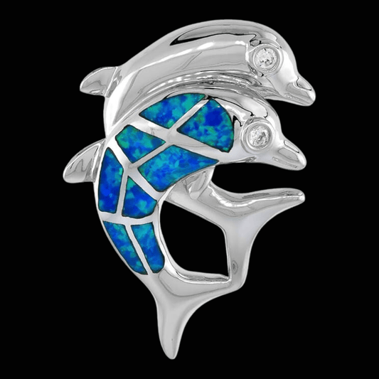 Sterling Silver Mosaic Opal Dolphins Pendant Necklace
