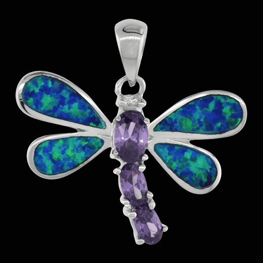 Sterling Silver Mosaic Opal Dragonfly Pendant With Purple Stones