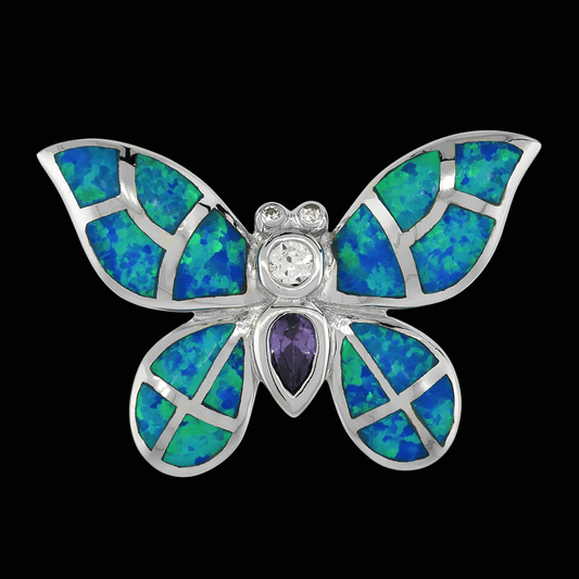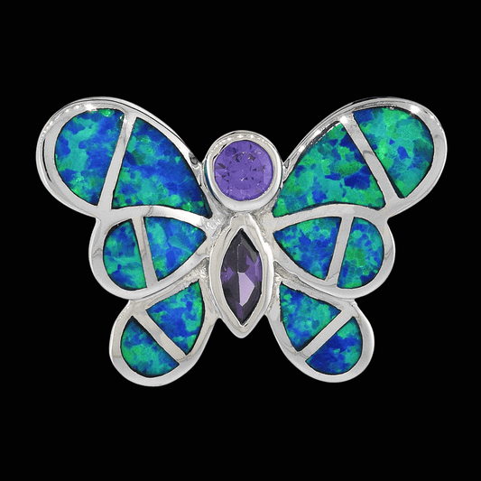Sterling Silver Mosaic Opal Butterfly Pendant With Purple Stones