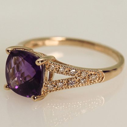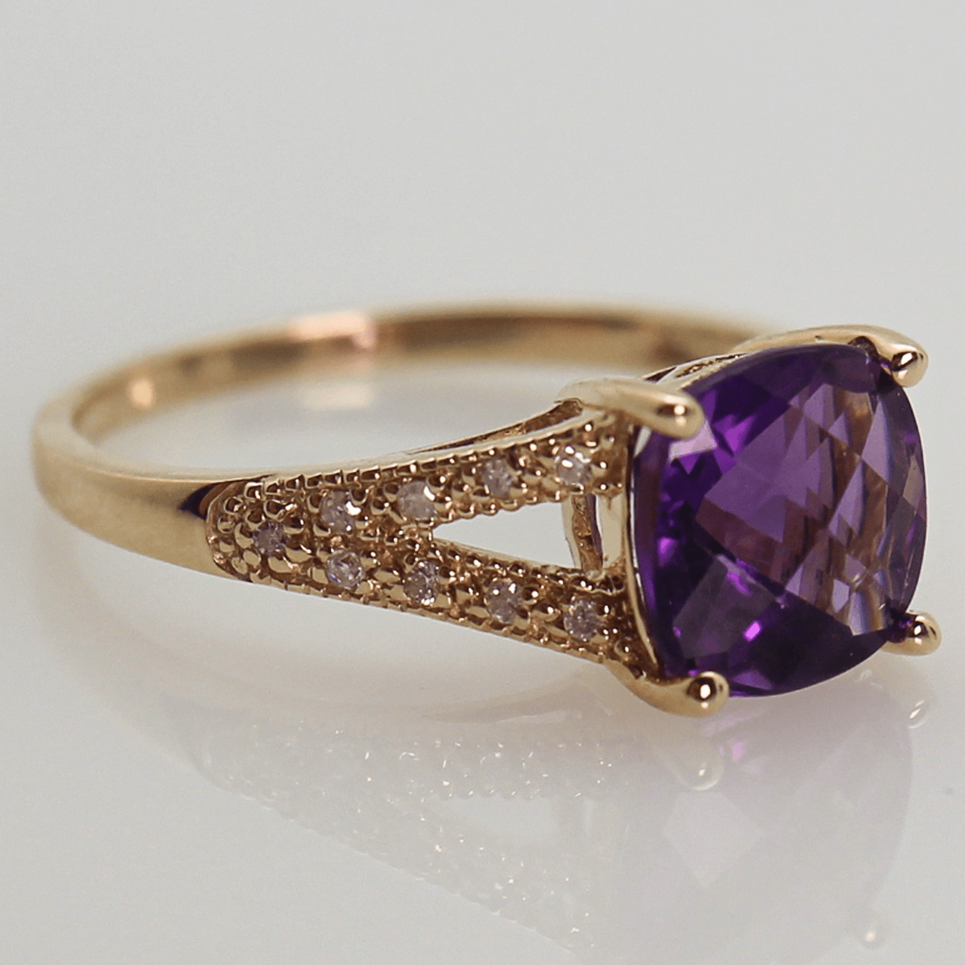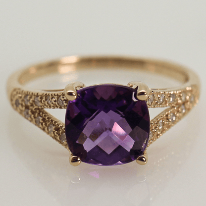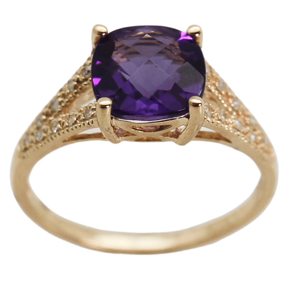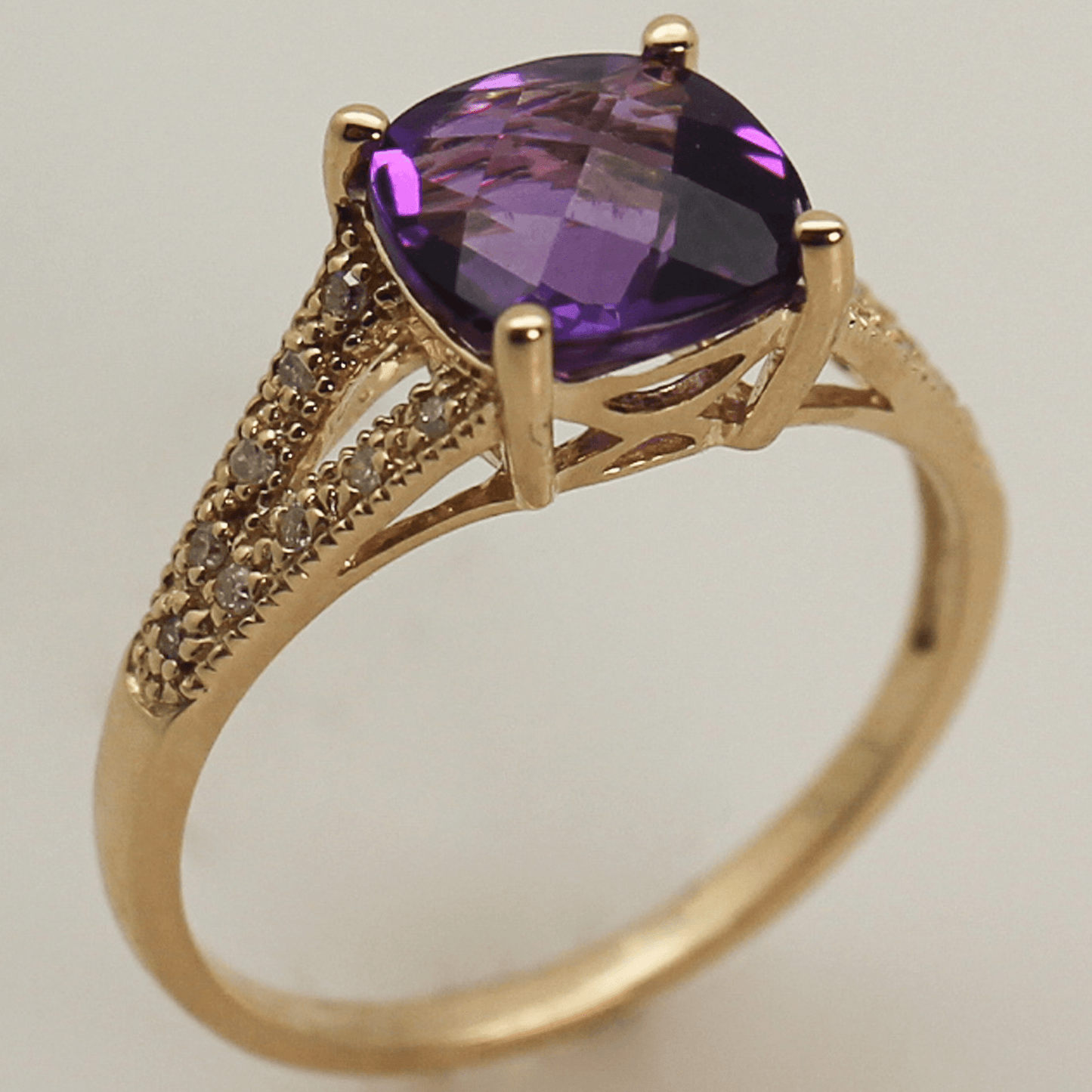 Discover the allure of this exquisite 10K Yellow Gold Cushion-Cut Amethyst Diamond Ring. This stunning piece artfully blends the rich hue of the cushion-cut amethyst with the brilliance of diamonds, all set in the timeless elegance of yellow gold. The combination of these elements not only highlights the beauty of the gemstones but also ensures durability and affordability, making it a truly special addition to any jewelry collection. Elevate your style with this remarkable ring today!