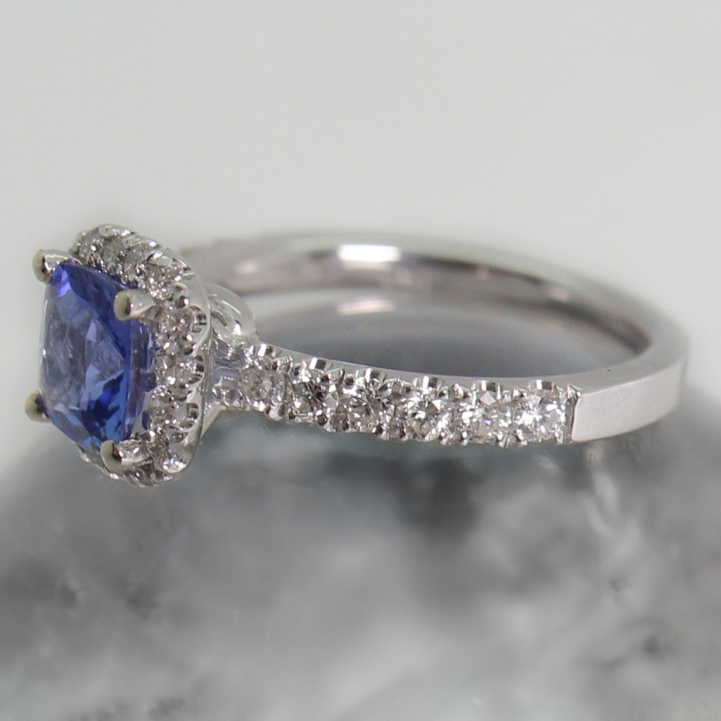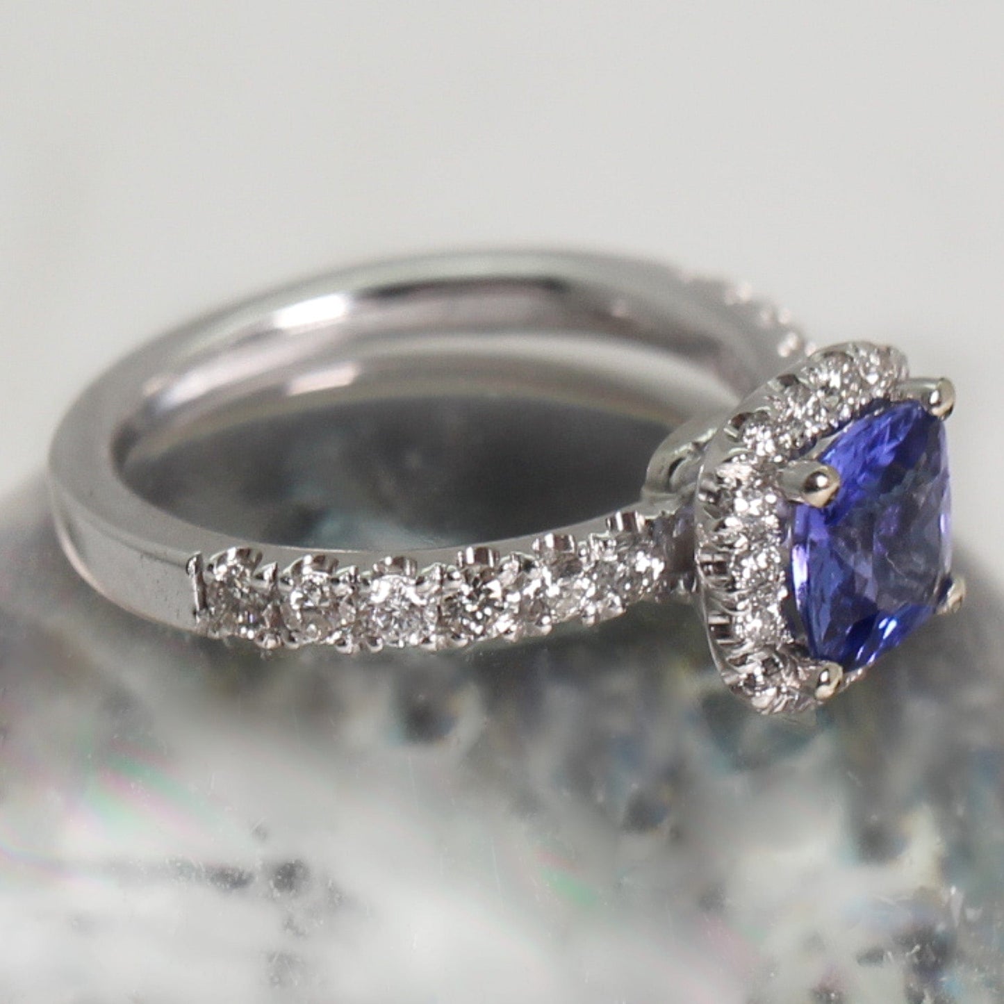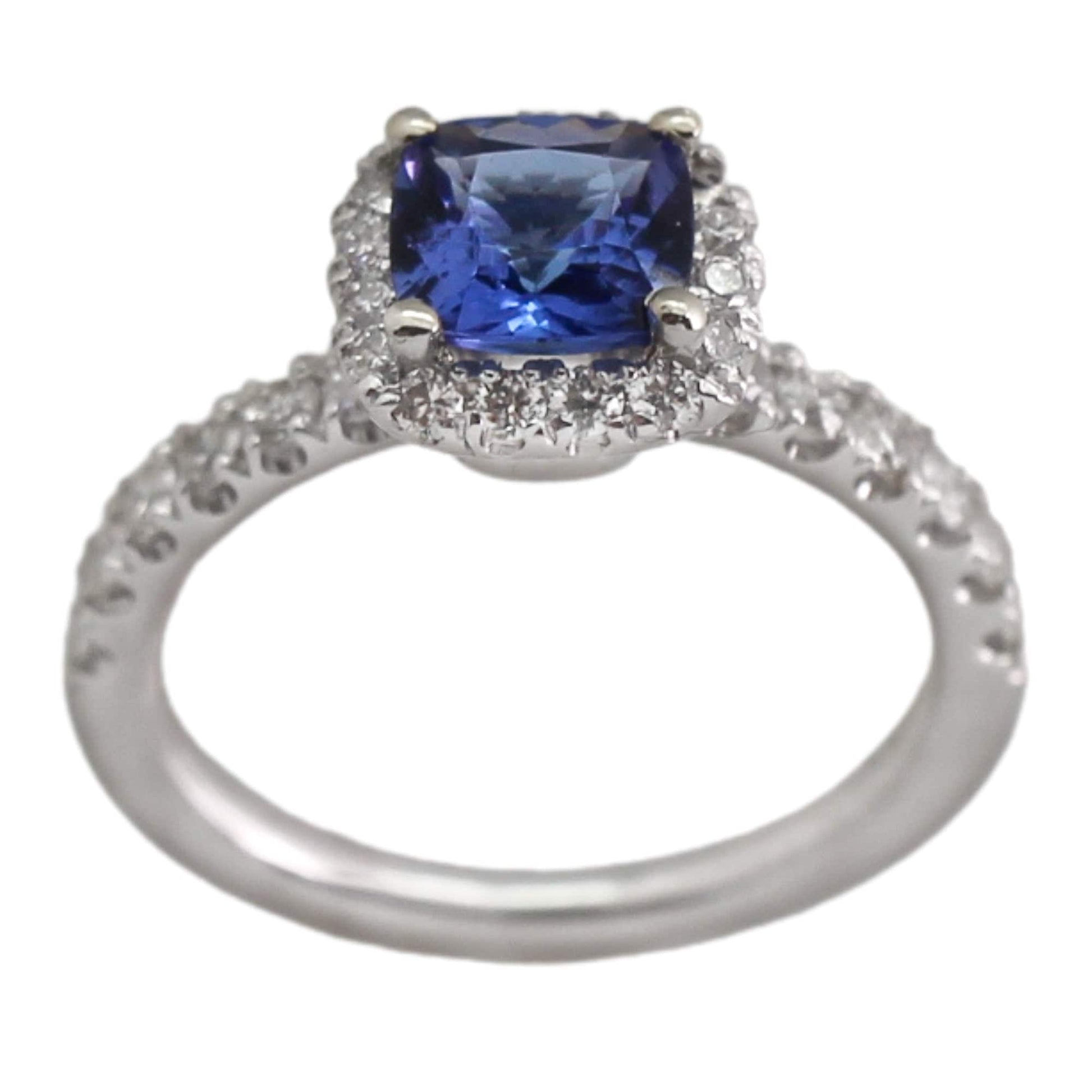 Experience the beauty and brilliance of this 14K White Gold Tanzanite Cushion Cut Diamond Ring. The stunning Halo of diamonds perfectly showcases the vibrant Tanzanite stone, while the additional diamonds on the band add extra shimmer. Elevate any look with this elegant and timeless piece.