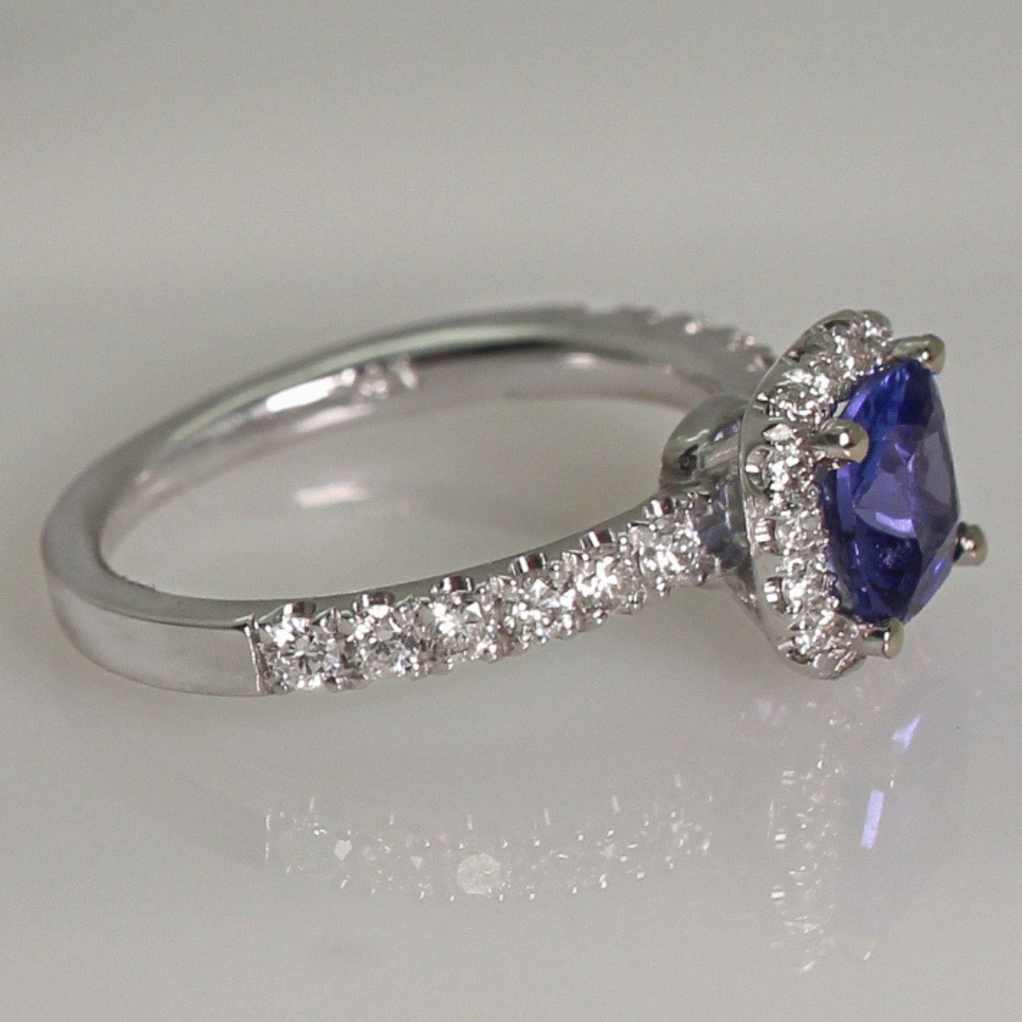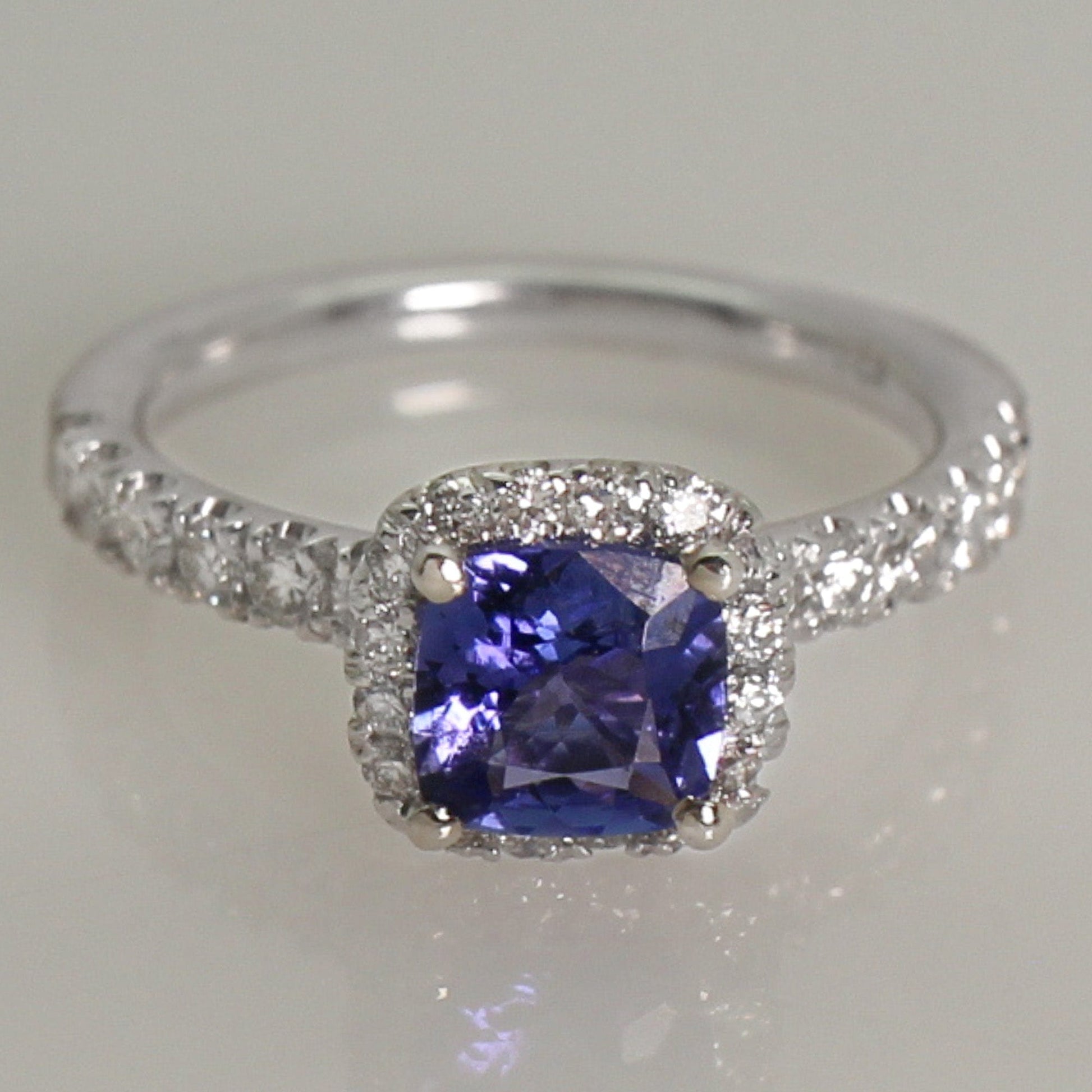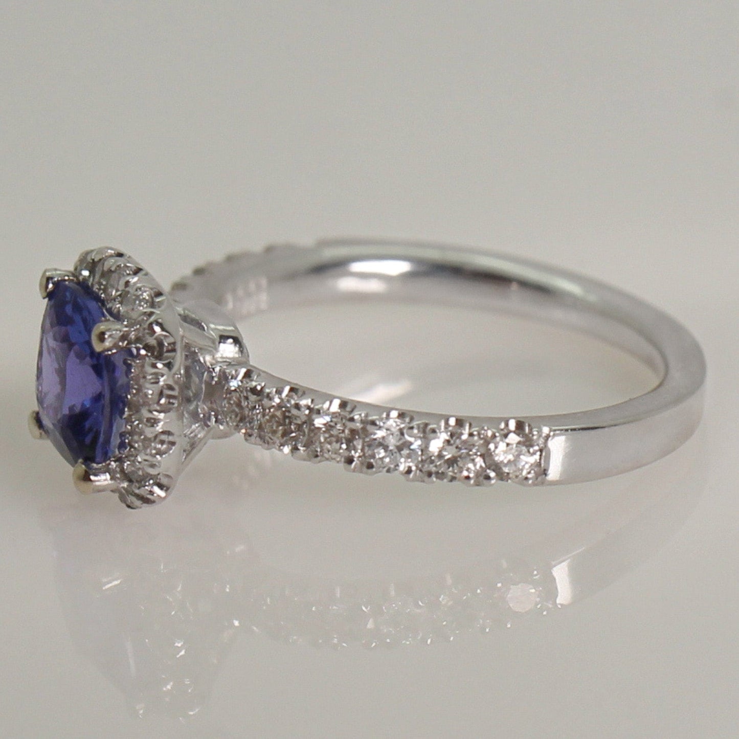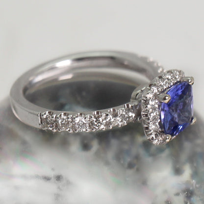 Experience the beauty and brilliance of this 14K White Gold Tanzanite Cushion Cut Diamond Ring. The stunning Halo of diamonds perfectly showcases the vibrant Tanzanite stone, while the additional diamonds on the band add extra shimmer. Elevate any look with this elegant and timeless piece.