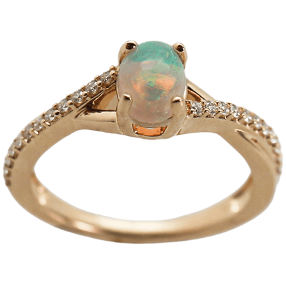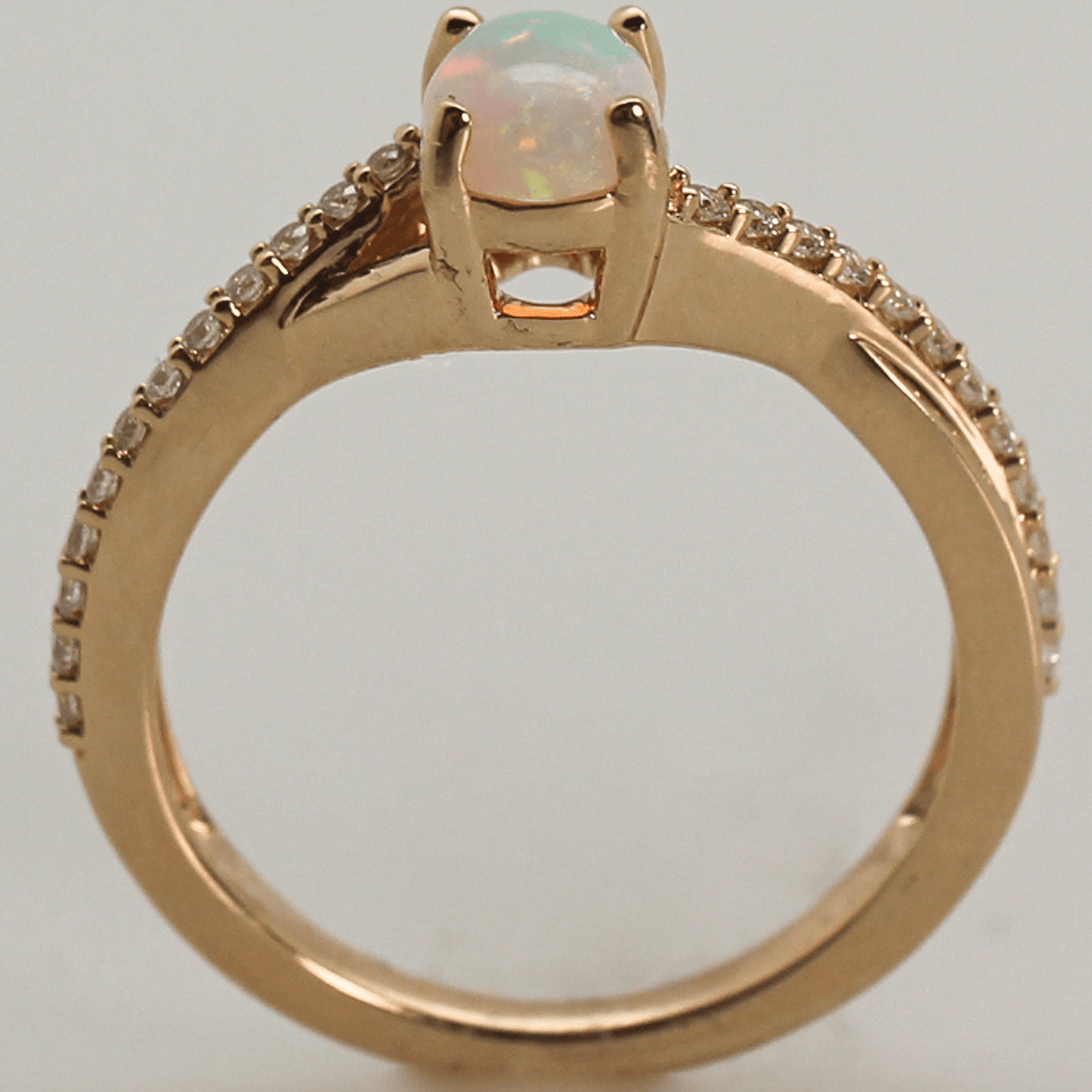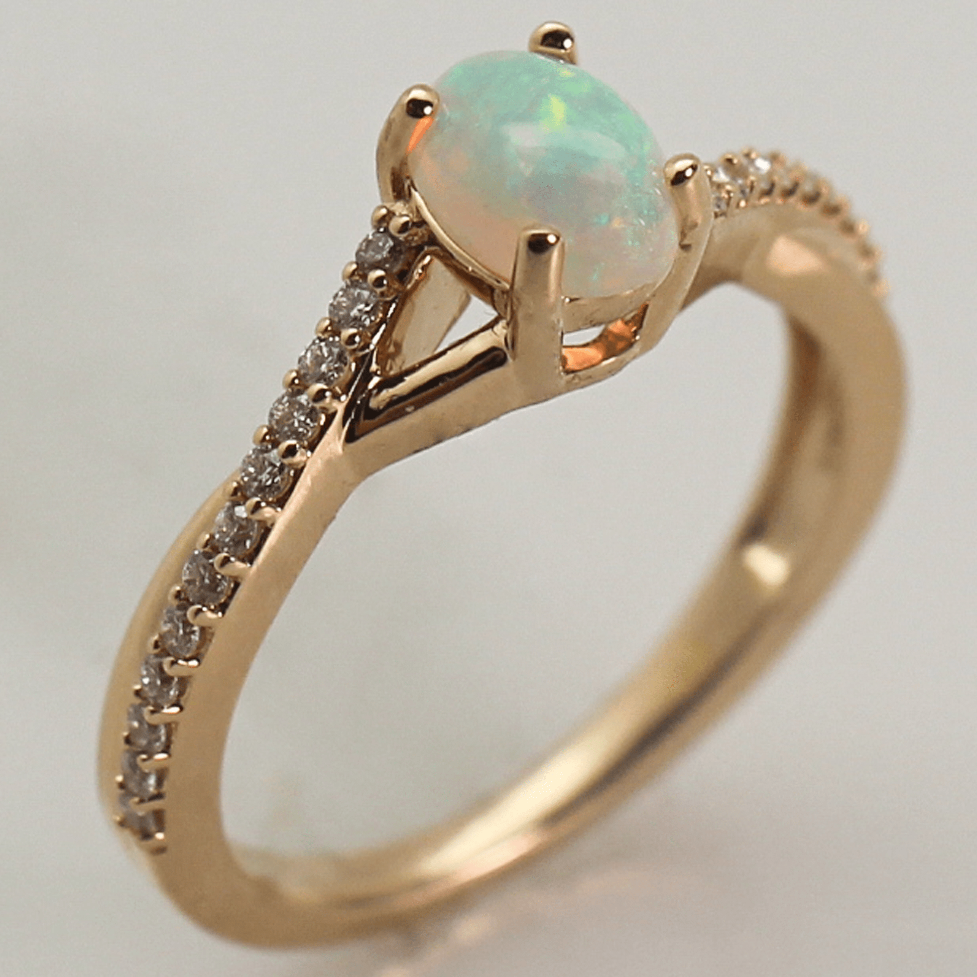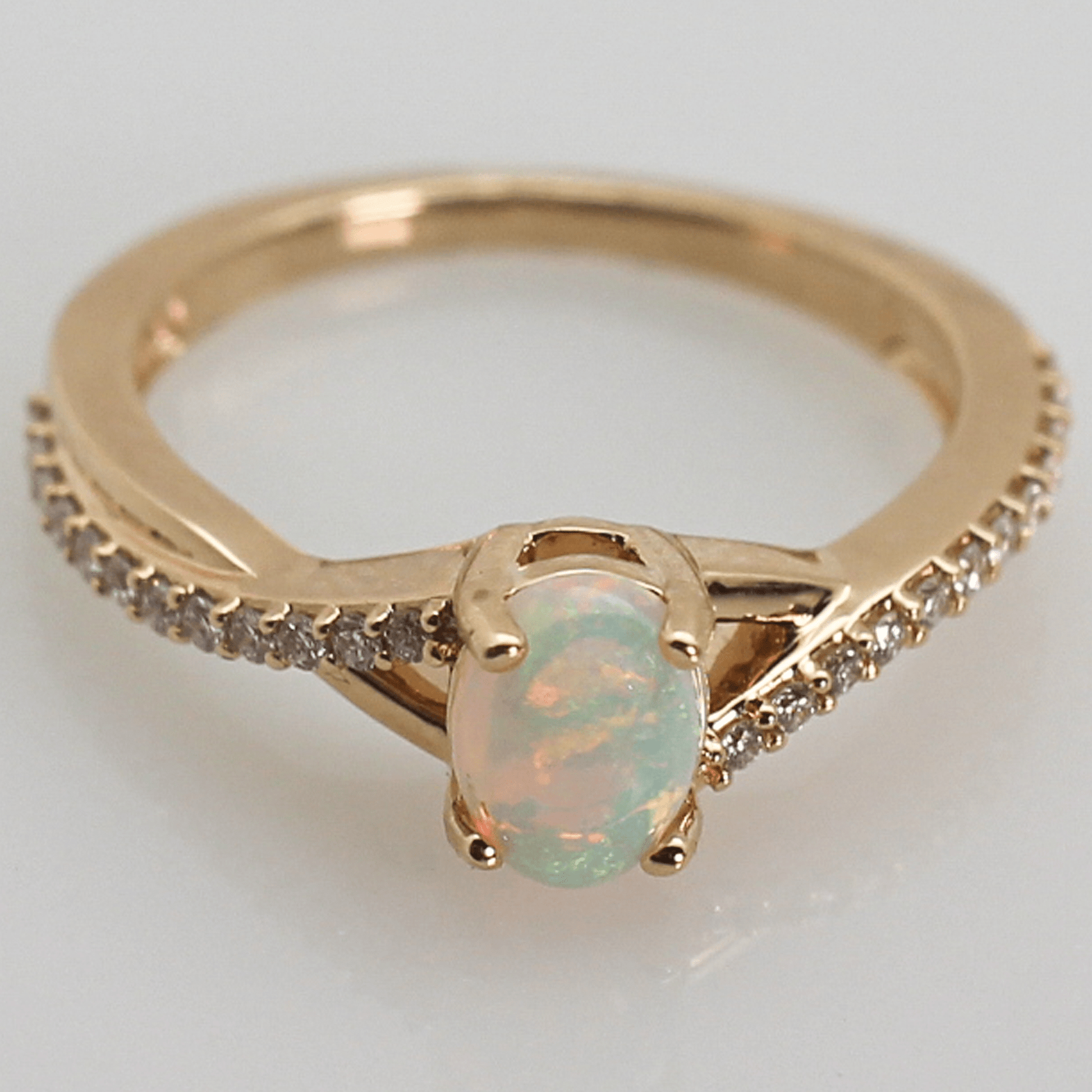 Discover the exquisite allure of this 14K Yellow Gold Oval Opal Ring adorned with Diamonds. The captivating interplay of the opal's vibrant colors, combined with the dazzling brilliance of the diamonds, creates a truly unique piece. Its classic oval shape is elegantly complemented by the diamonds that grace the band, enhancing the overall beauty of the ring. The warm tones of the 14K yellow gold serve as a perfect backdrop, accentuating both the opal's enchanting hues and the sparkling diamonds. Elevate your jewelry collection with this stunning masterpiece today.