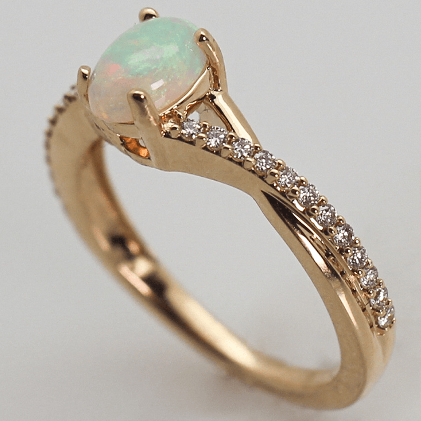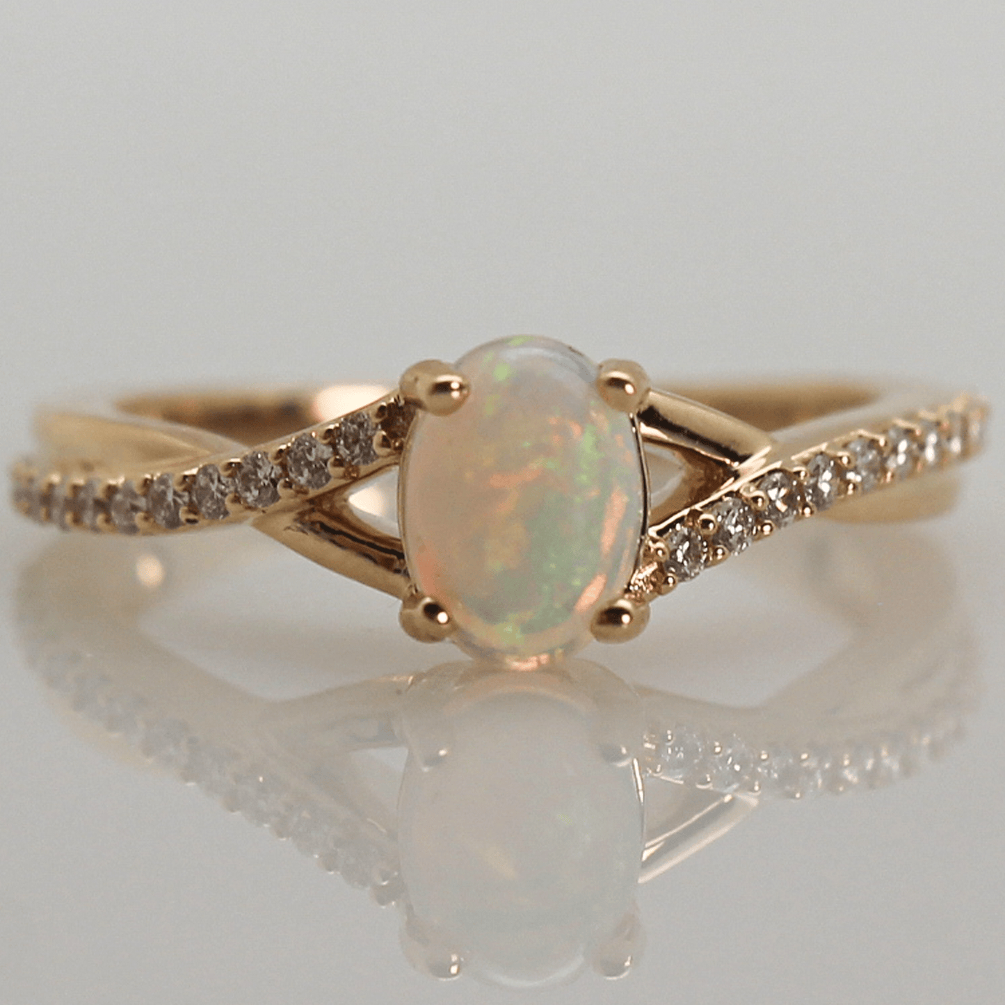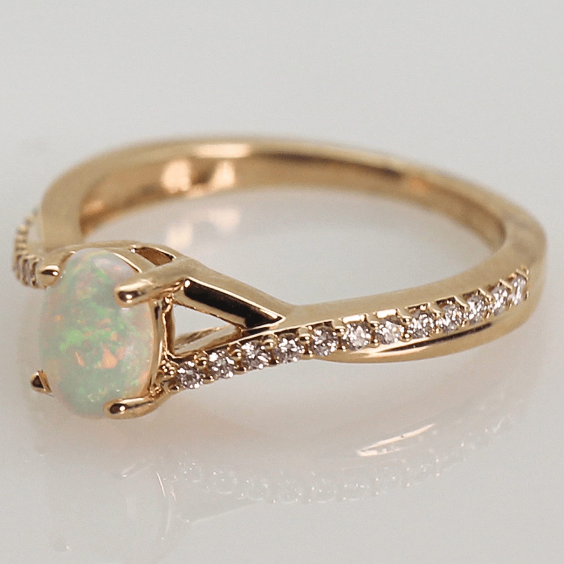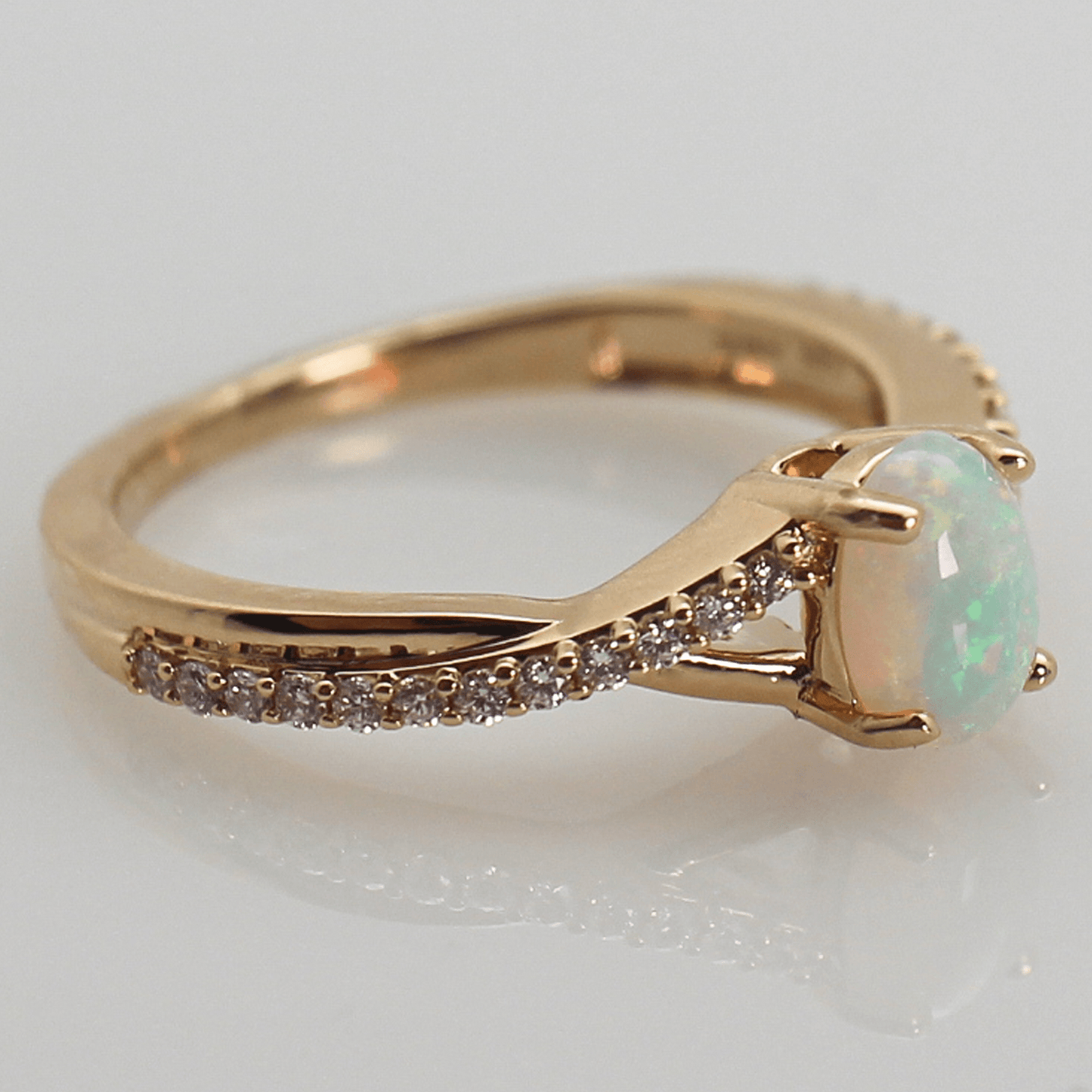 Discover the exquisite allure of this 14K Yellow Gold Oval Opal Ring adorned with Diamonds. The captivating interplay of the opal's vibrant colors, combined with the dazzling brilliance of the diamonds, creates a truly unique piece. Its classic oval shape is elegantly complemented by the diamonds that grace the band, enhancing the overall beauty of the ring. The warm tones of the 14K yellow gold serve as a perfect backdrop, accentuating both the opal's enchanting hues and the sparkling diamonds. Elevate your jewelry collection with this stunning masterpiece today.