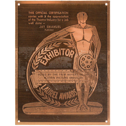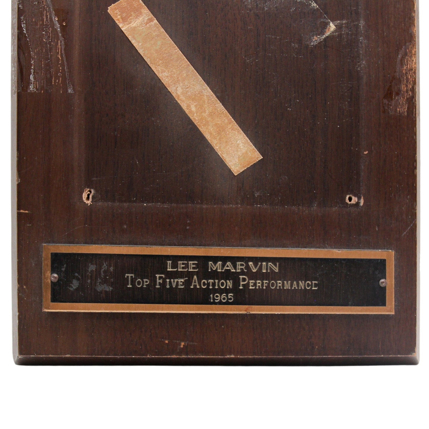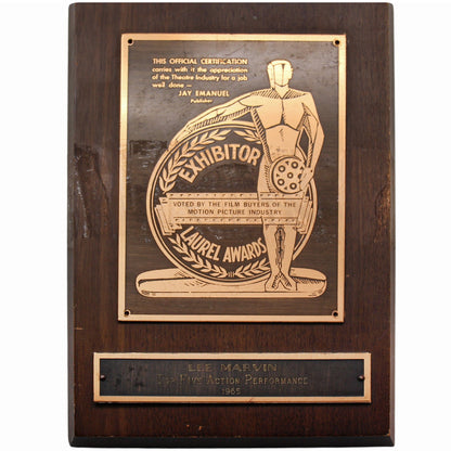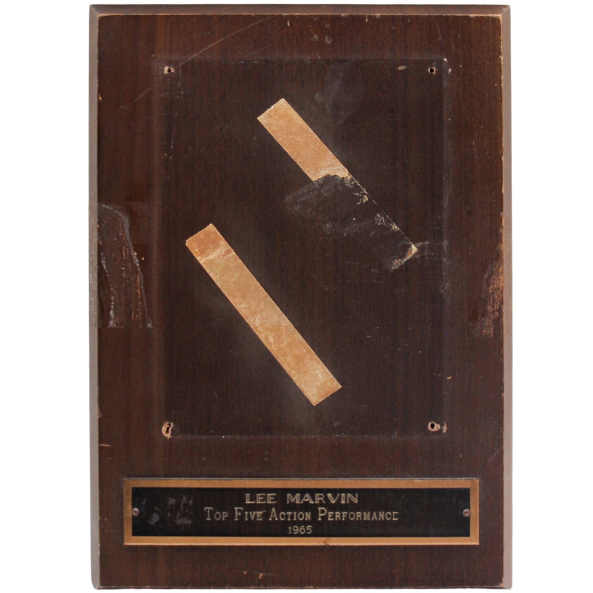 Condition Report: This 1965 Laurel Award Lee Marvin Top 5 Action Performance shows natural wear and tear such as discoloration, scruff, scrapes, and dings. The plate is missing screws, detached from the wooden board. For more information regarding the condition of this item please contact us directly.