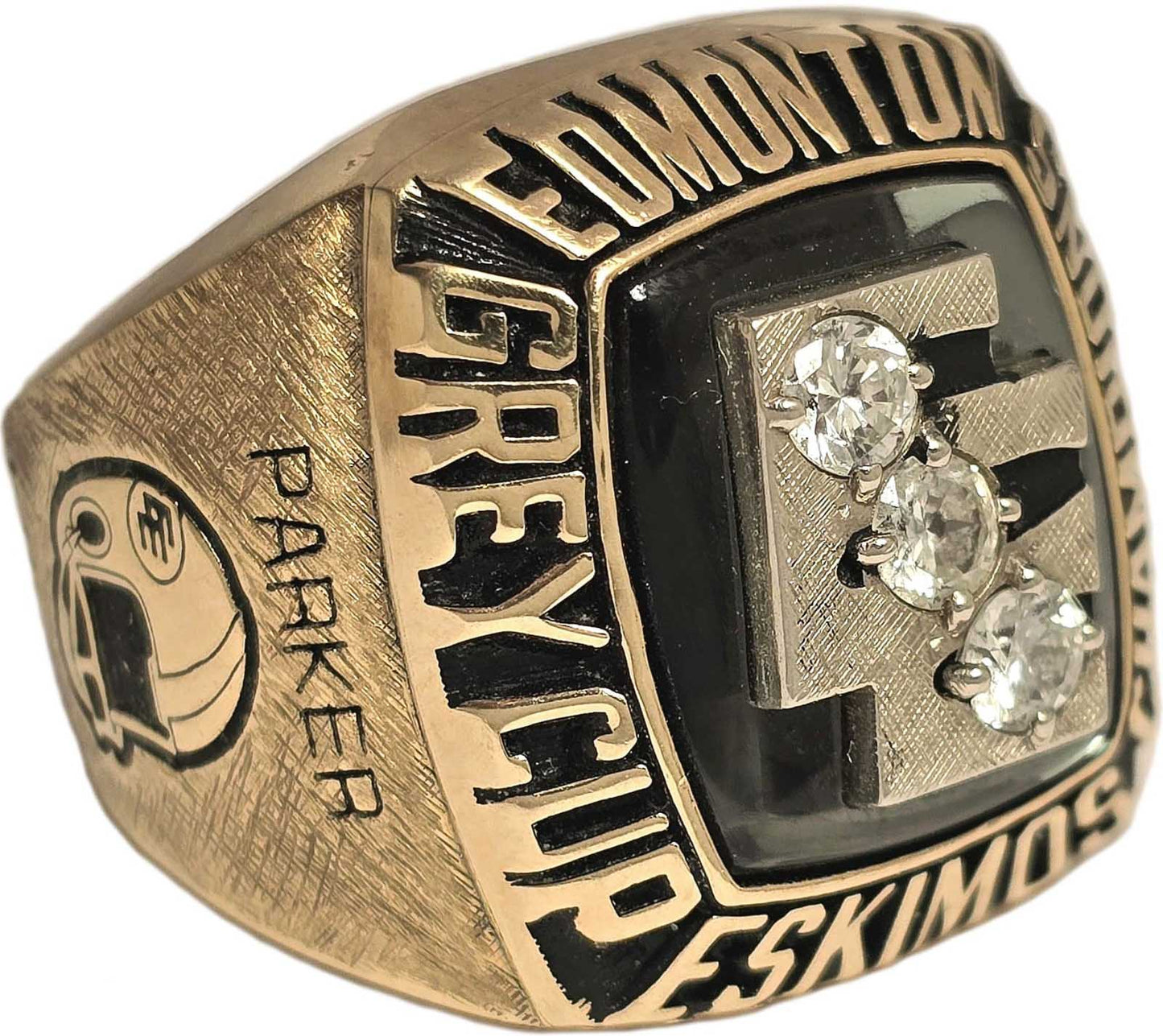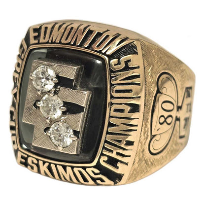 Player ring from the 1980 Edmonton Eskimos Grey Cup Victory in 10k yellow gold made by Jostens. The 1980 Eskimos cemented a dynasty with their third consecutive Grey Cup win. Edmonton would proceed to win in 1981 and 82 to earning a League record 5 consecutive Grey Cups, a feat that has never been repeated.