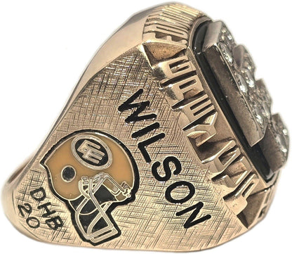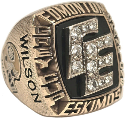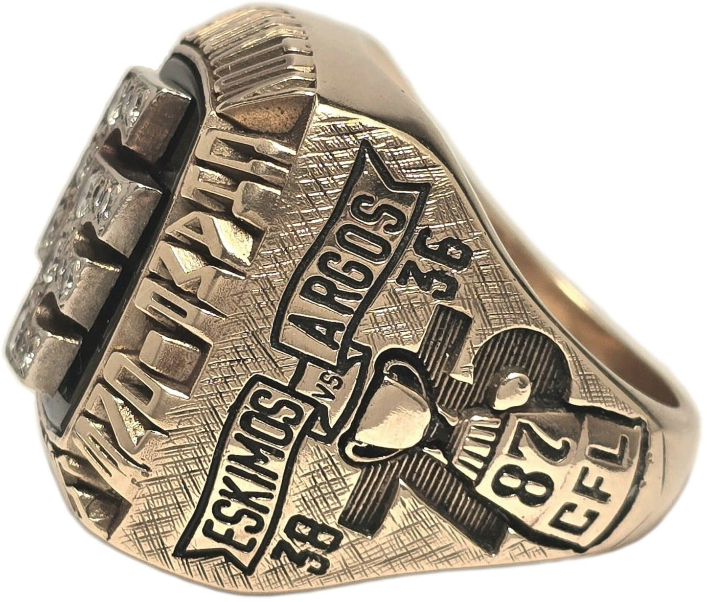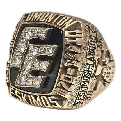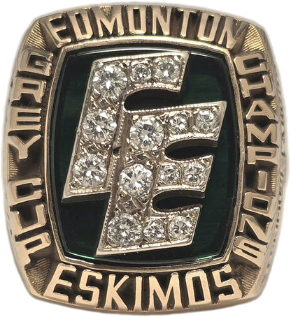 Player ring from the 1987 Grey Cup victors the Edmonton Eskimos. This ring features a timeless design in 10k yellow gold with a diamond encrusted Eskimos logo on a green stone background.