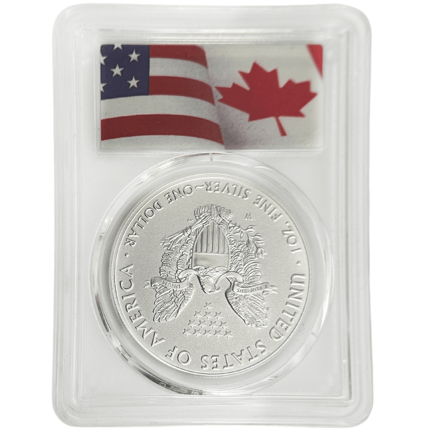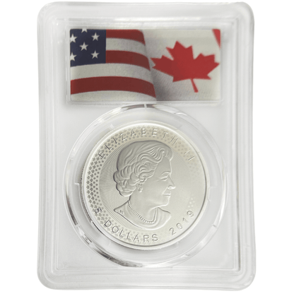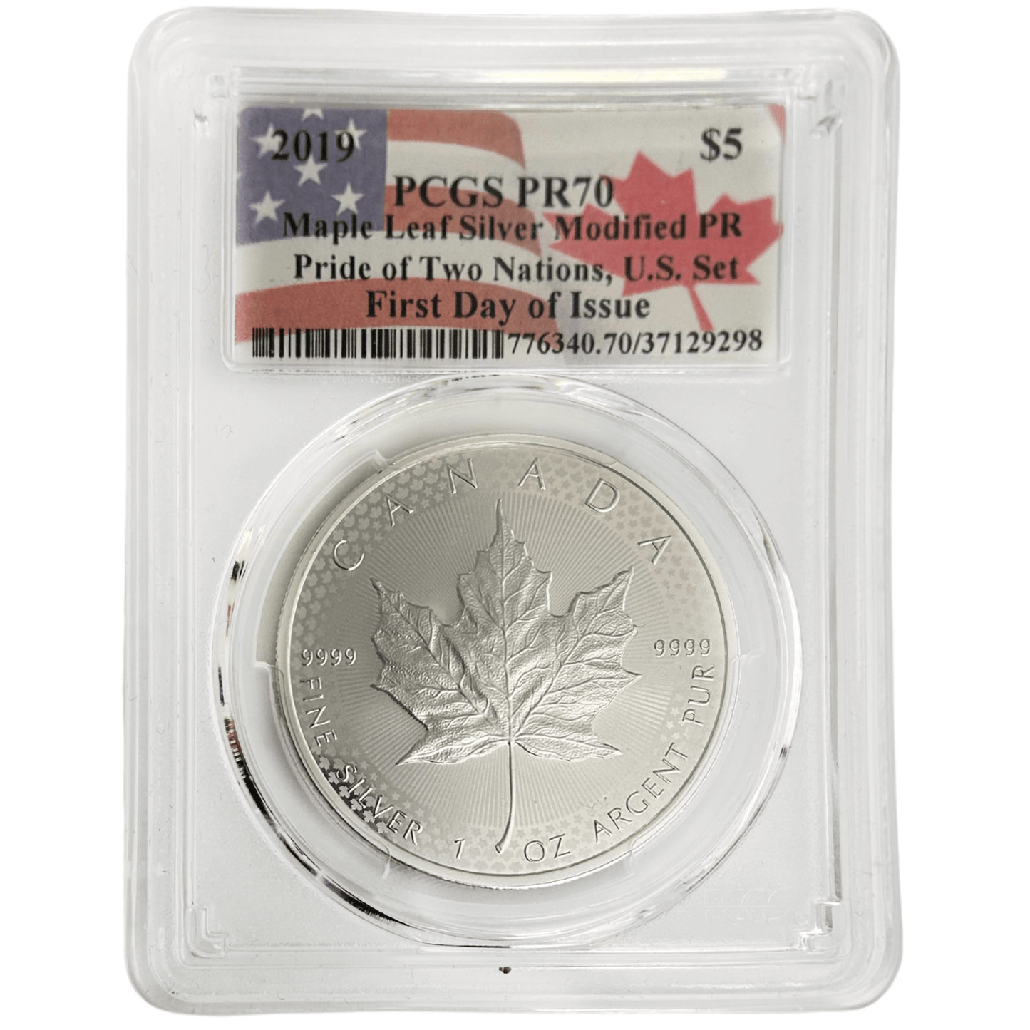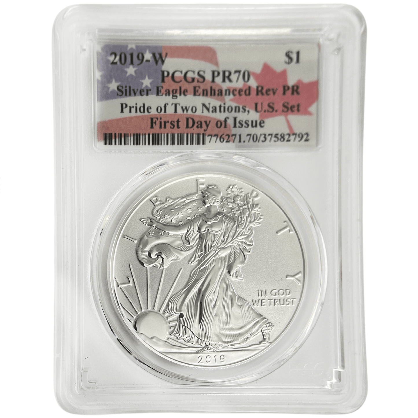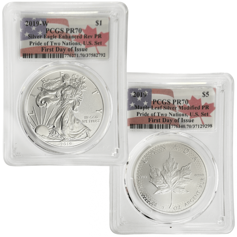 The 2019 "Pride of Two Nations" coin set, which includes a 2019 W Eagle $1 and a 2019 Maple Leaf Canada S$5 Coin, made to celebrate the enduring friendship and trade relationship between the United States and Canada. Each coin contains 1 oz of silver, is from the first day of issue and has received a perfect PR 70 grade from PCGS.