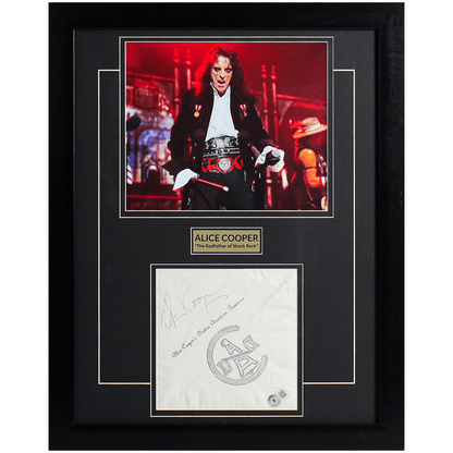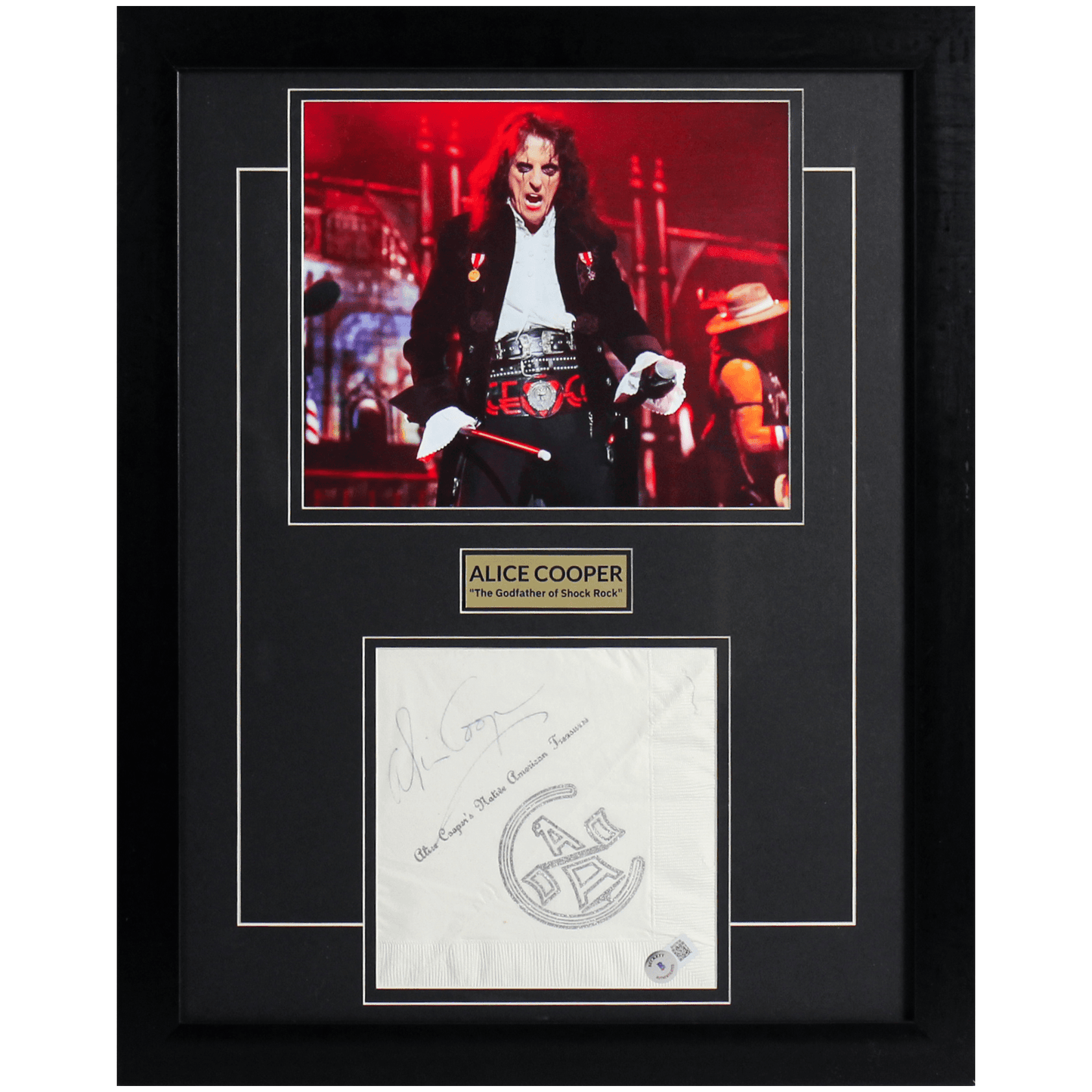 New memorabilia featuring a bar napkin hand signed by Alice Cooper, authenticated by Beckett with digital COA. Renowned for his role in pioneering "shock rock," Alice Cooper blends theatricality with music, creating performances that are both macabre and captivating. His shows often feature horror-inspired props such as electric chairs and guillotines, alongside a diverse musical career that has garnered him a loyal following. The combination of his autograph and Beckett's certification transforms this signed napkin into a valuable collectible for fans and enthusiasts alike.