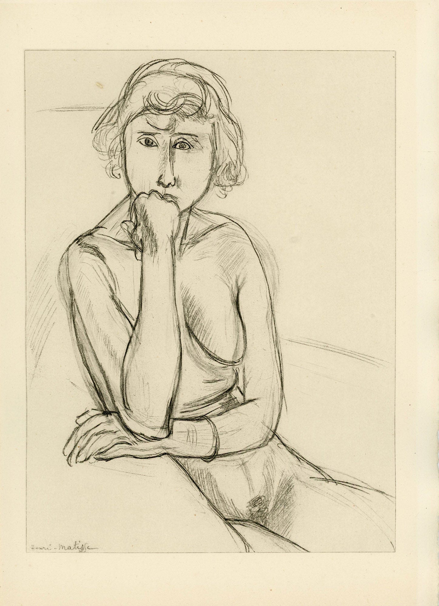 Beautiful artwork from the famed French visualist, Henri Matisse. This collection was produced to coincide with an exhibition of Matisse's artwork at one of the oldest art galleries in Paris, the Bernheim-Jeune in 1920. This collection entitled "Cinquante Dessins" featured 50 full-page plates of Matisse’s illustrations of women with the frontispiece being an etching of Matisse’s daughter.