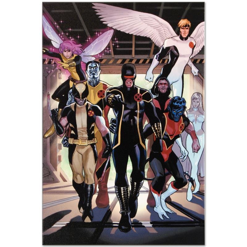 A piece of comic book history, this limited edition, from original art by Daniel Acuna, depicts Cyclops, Wolverine, Nightcrawler and Angel, among other X-Men Characters. Spanish artist Daniel Acuna cites artists like Jack Kirby and Simon Bisley as his early artist influences. After doing some occasional cover art for Marvel, Acuna entered an exclusive contract with Marvel in 2007. "X-Men Annual Legacy #1" is a numbered limited edition giclee on canvas by Daniel Acuna presented by Marvel Comics. This piece comes gallery wrapped. Includes Certificate of Authenticity. Measure approx. 18" x 27" (image). This item requires special handling and may have a longer than usual turnaround.