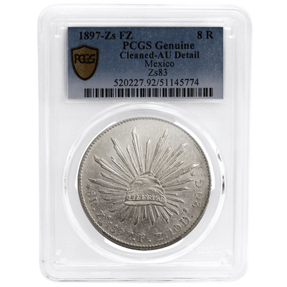 PCGS Genuine Cleaned-AU Detail Mexico Republic Silver Coin. Each coin is securely encapsulated and has received a grading from the Professional Coin Grading Service (PCGS), which highlights its condition and historical significance. These coins mark a pivotal era in Mexico's history, being the first silver coins minted by the Mexican Republic from 1823 to 1897, symbolizing the nation's transition to independence following Spanish colonial rule. Don't miss the chance to add this remarkable piece to your collection—click the purchase button to secure yours today!