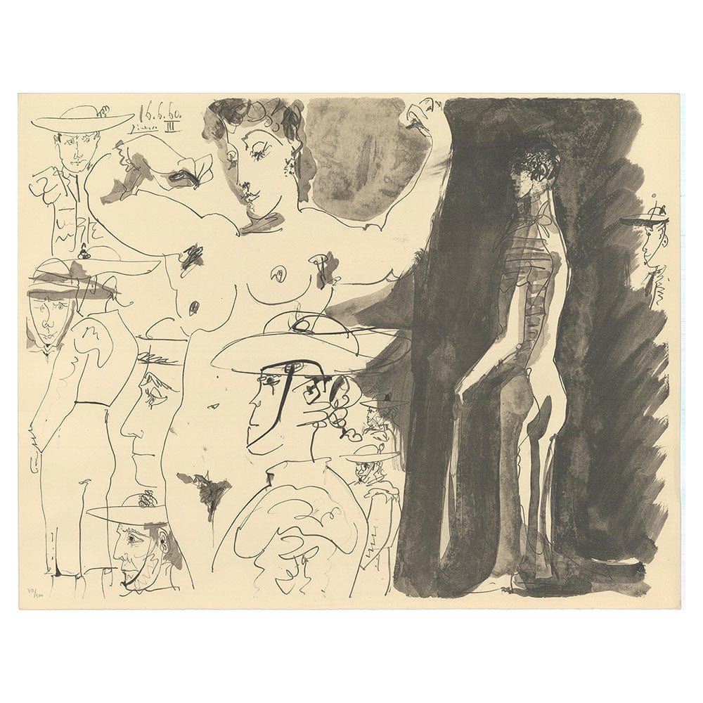 The plates of Toros were printed on Arches Vellum paper by Daniel Jacomet. The poem is typeset in Garamond Corps 24 and was printed on December 15, 1960, on the press of the Union Printing House in Paris. The 500 copies were numbered at the press with additional twenty copies numbered from I to XX. The copies 1 to 50 are accompanied by an original lithograph, printed on the presses of Mourlot Frères, numbered and signed by the artist. The seven of fifteen plates in our copy are hand-numbered in pencil and signed and dated by Picasso in plate.