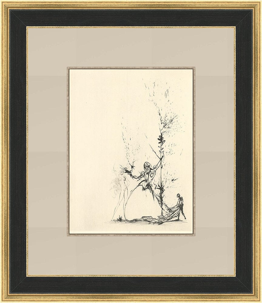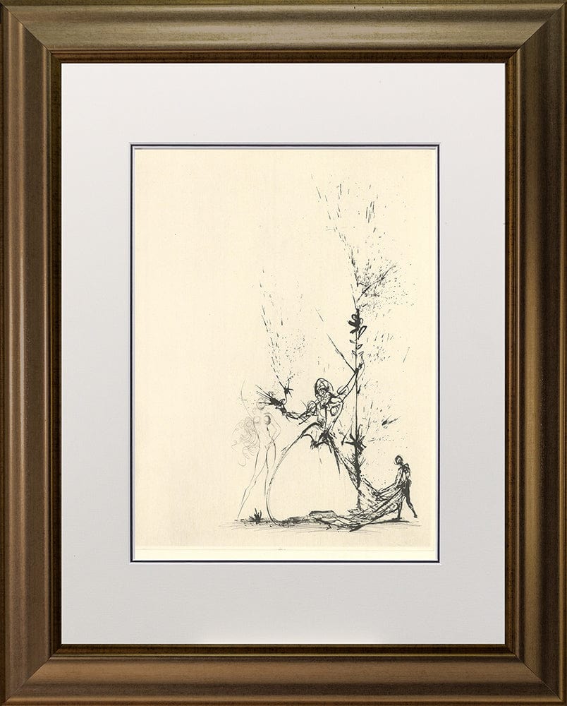 This graceful original etching is part of Salvador Dalí’s 1968 portfolio "Les Amours de Cassandre," a surrealist tribute to the romantic sonnets of French Renaissance poet Pierre de Ronsard. Published by Dalí's close collaborator Pierre Argillet, the work showcases the artist's mastery of the drypoint technique, utilizing fine, wispy lines to create spectral figures and dreamlike imagery directly on the copper plate. Unlike his heavier commercial prints, this piece captures the spontaneity and intimacy of a sketch, offering a rare blend of 16th-century classicism and 20th-century Surrealism.