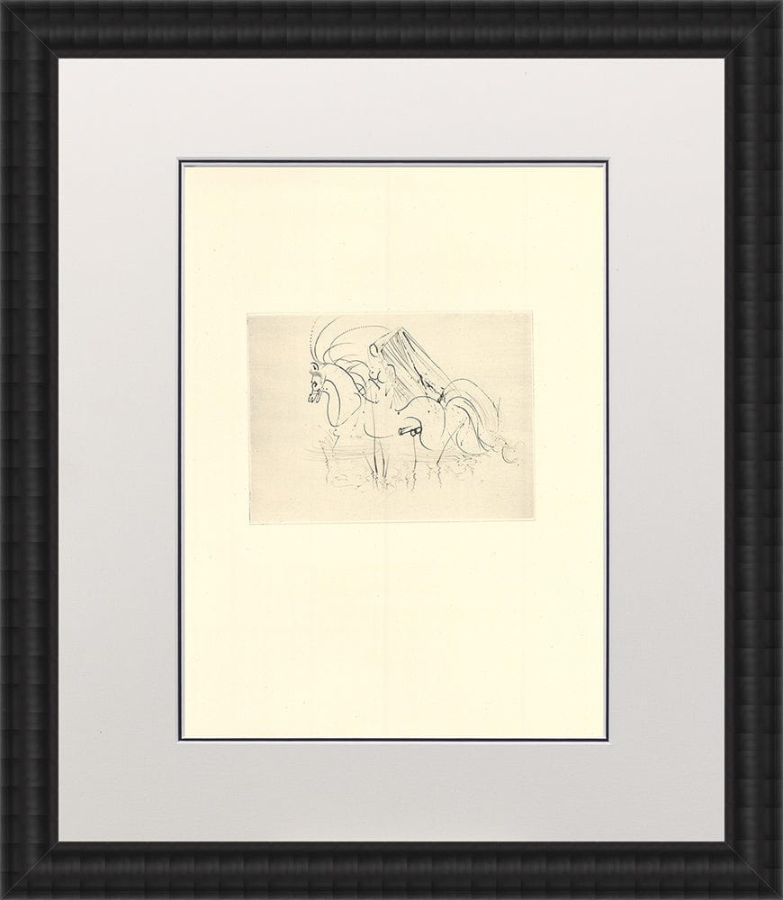 This elegant original etching vignette is part of Salvador Dalí’s 1968 portfolio "Les Amours de Cassandre," a surrealist tribute to the romantic sonnets of French Renaissance poet Pierre de Ronsard. Published by Dalí's close collaborator Pierre Argillet, the work showcases the artist's mastery of the drypoint technique, utilizing fine, wispy lines to create spectral figures and dreamlike imagery directly on the copper plate. Unlike his heavier commercial prints, this piece captures the spontaneity and intimacy of a sketch, offering a rare blend of 16th-century classicism and 20th-century Surrealism.