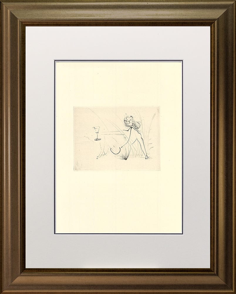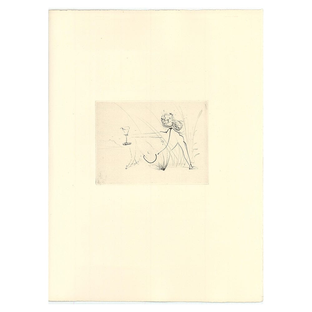 This elegant original etching vignette is part of Salvador Dalí’s 1968 portfolio "Les Amours de Cassandre," a surrealist tribute to the romantic sonnets of French Renaissance poet Pierre de Ronsard. Published by Dalí's close collaborator Pierre Argillet, the work showcases the artist's mastery of the drypoint technique, utilizing fine, wispy lines to create spectral figures and dreamlike imagery directly on the copper plate. Unlike his heavier commercial prints, this piece captures the spontaneity and intimacy of a sketch, offering a rare blend of 16th-century classicism and 20th-century Surrealism.