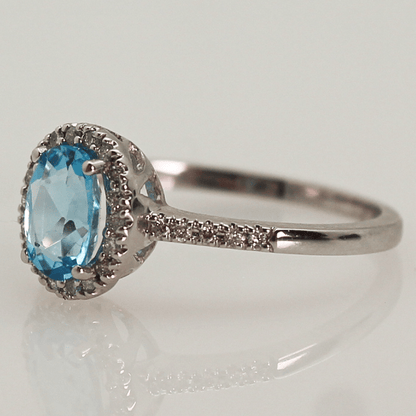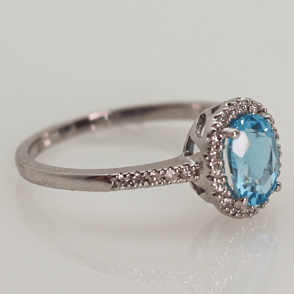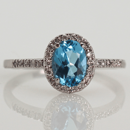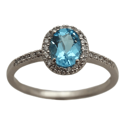 Discover the elegance of a 10KWG Blue Topaz Diamond Halo Ring. Crafted from 10 karat white gold, this exquisite piece features a stunning blue topaz at its center, surrounded by a halo of sparkling diamonds. The combination of the tranquil blue hue and the brilliance of the diamonds creates a striking contrast, making this ring a standout addition to any jewelry collection. With its durable and affordable white gold band, this ring is not only beautiful but also practical. Elevate your style with this captivating piece today!
