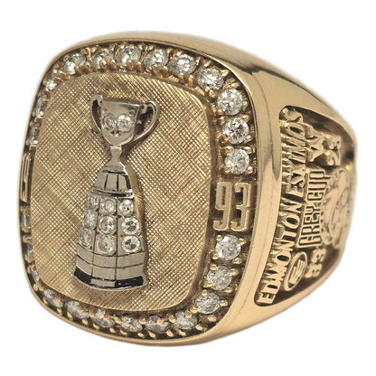 Player ring from the 1993 Edmonton Eskimos Grey Cup winning season. This ring was made by Jostens in 10k yellow gold and prominently features a Grey Cup inlaid with 11 diamonds, representing the franchise's 11 Grey Cup wins at the time. The ring is bordered by a line of diamonds with an enameled Eskimos logo on the left shank.