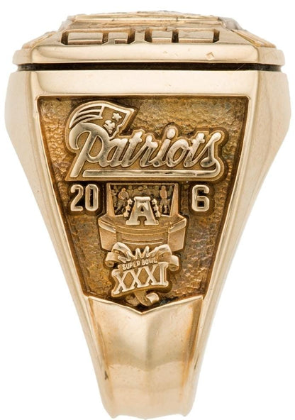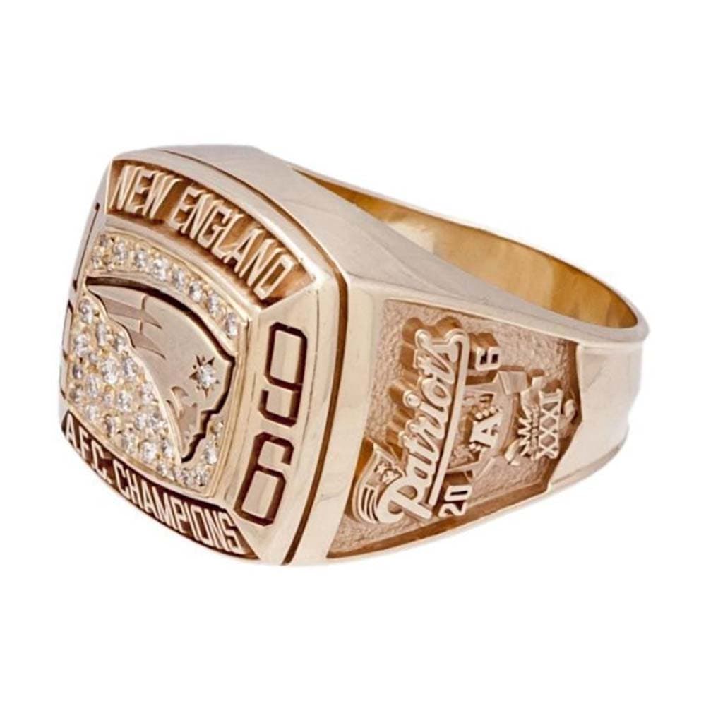 Player ring from the New England Patriots AFC Championship season. This ring is made from 10k yellow gold with a Patriots logo over a field of diamonds.