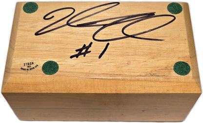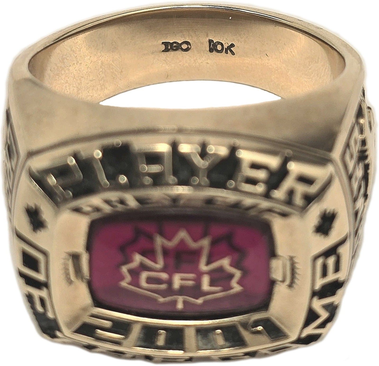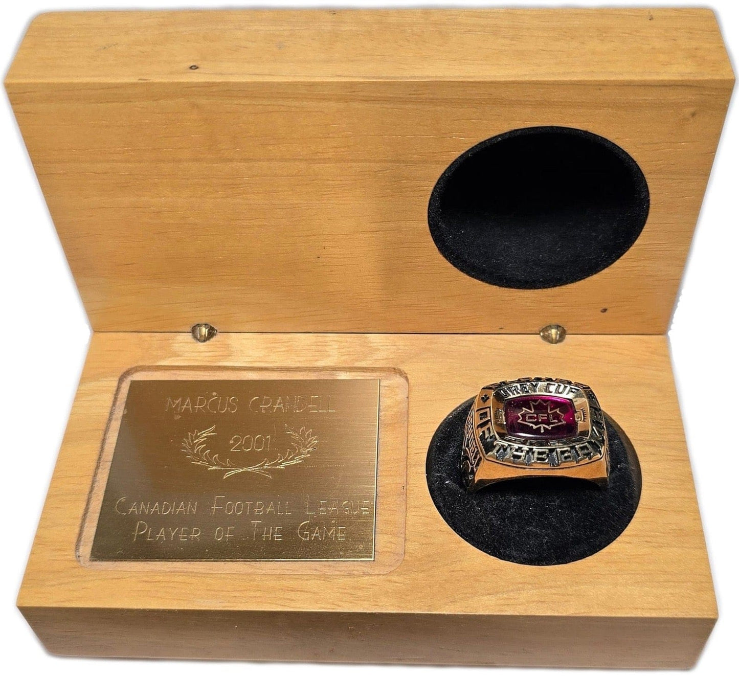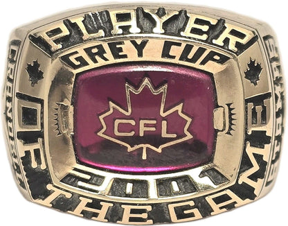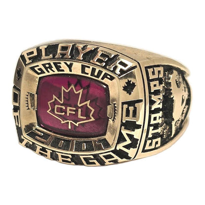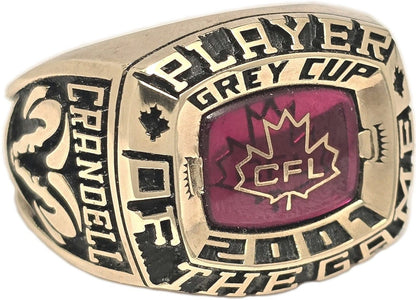 A rare find, this is the Player of the Game ring awarded to Calgary Stampeders QB Marcus Crandell, for his Grey Cup winning performance in 2001. The 10k yellow gold ring also includes the original display box which has been autographed by Crandell. The ring has a timeless design with a prominent CFL logo on a red stone background, the Calgary Stampeders logo on the right shank and the sponsor, Dodge Ram logo on the left.