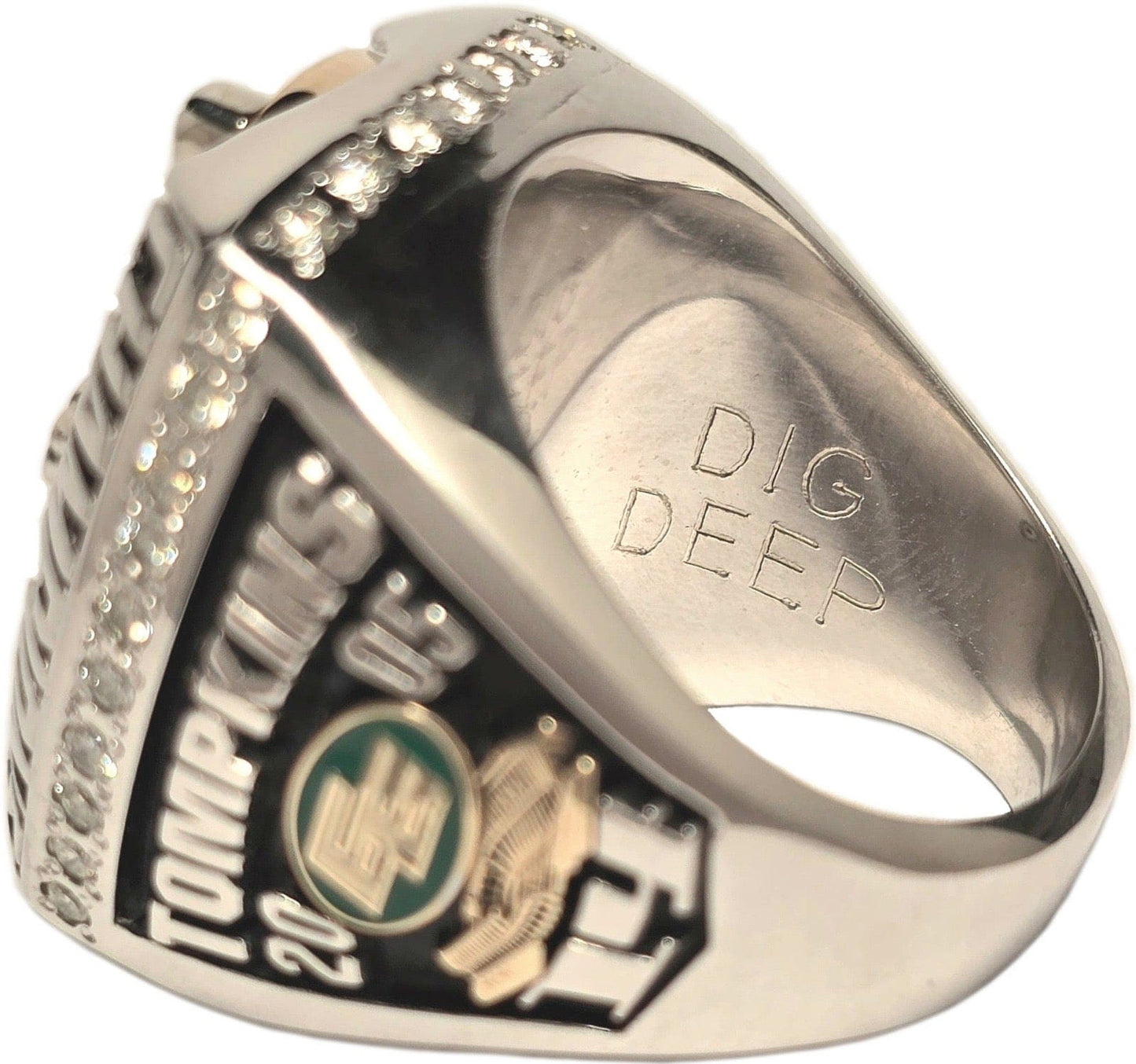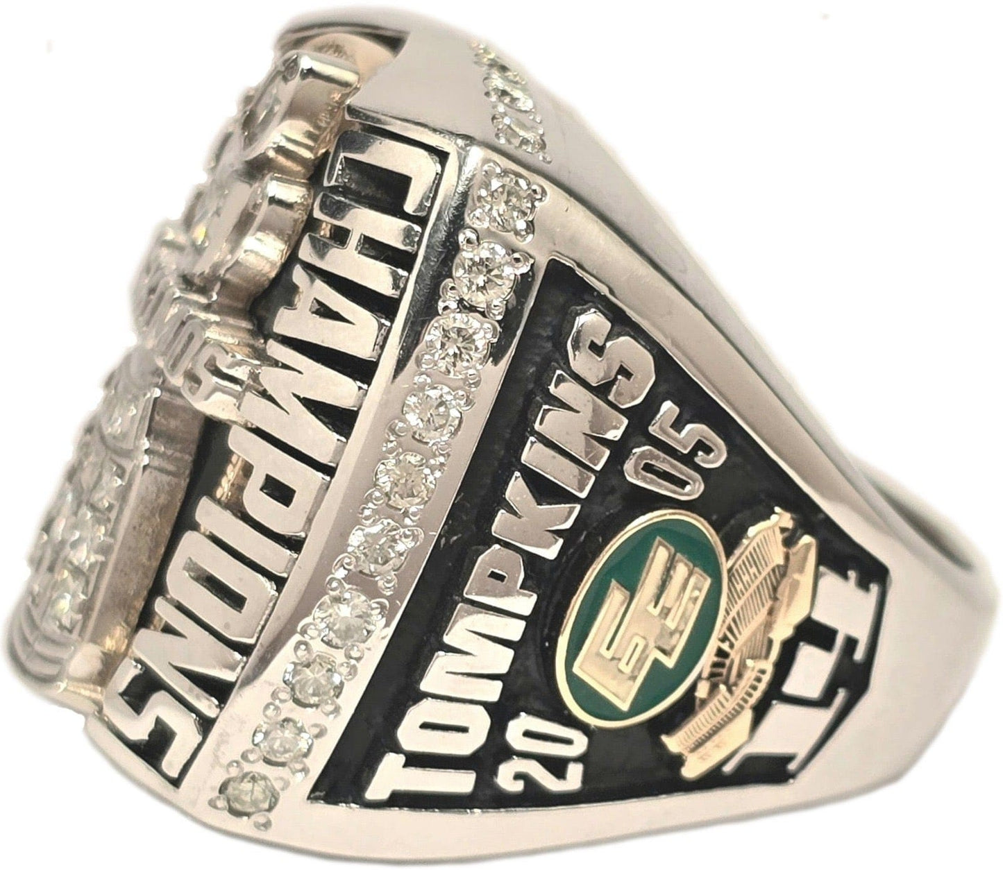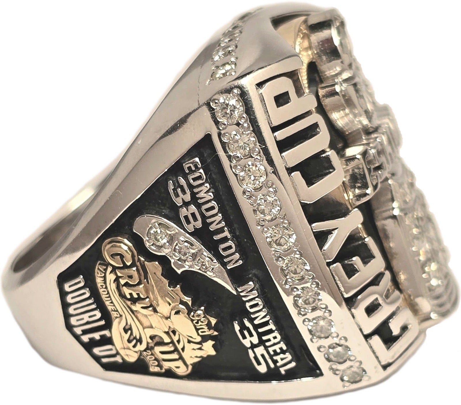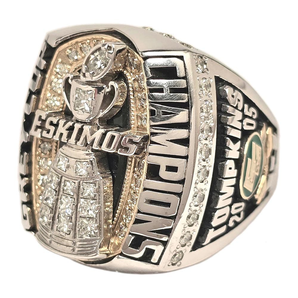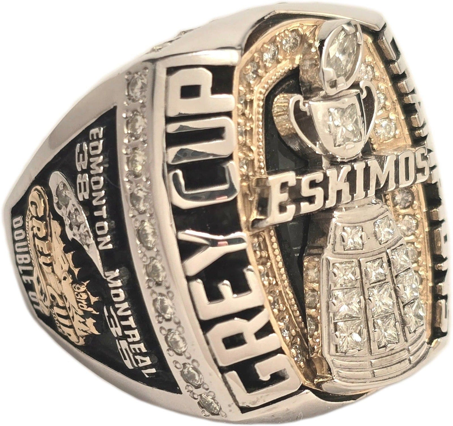 Player ring from the 2005 Edmonton Eskimos Grey Cup winning season. This beautiful ring is made from 10k white gold and intricately detailed with a prominent Grey Cup in the center. 2005 was the Eskimos 34th consecutive year earning a playoff berth. The game was a CFL classic, going into double overtime with Edmonton defeating Montreal 38-35.