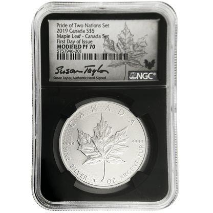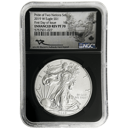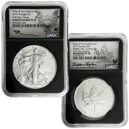 2019 "Pride of Two Nations" coin set featuring the most collected coins from Canada and the United States. The set contains a 2019 enhanced reverse proof West Point Eagle $1 and a 2019 Maple Leaf Canada S$5, both are first day of issue coins made with 1 oz of silver and graded PF 70 by NGC with special "Pride of Two Nations" labels signed by John Mercanti for the Eagle and Susan Taylor for the Maple Leaf. Perfect for collectors, this set commemorates the friendship and trade between two great nations.