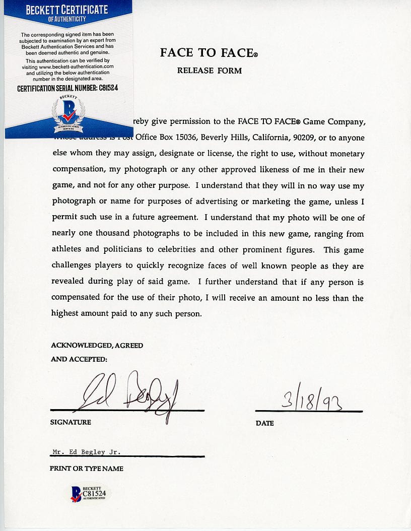 This signature was obtained during the process of creating the Face to Face board game asking permission to use the celebrity's image in the game.