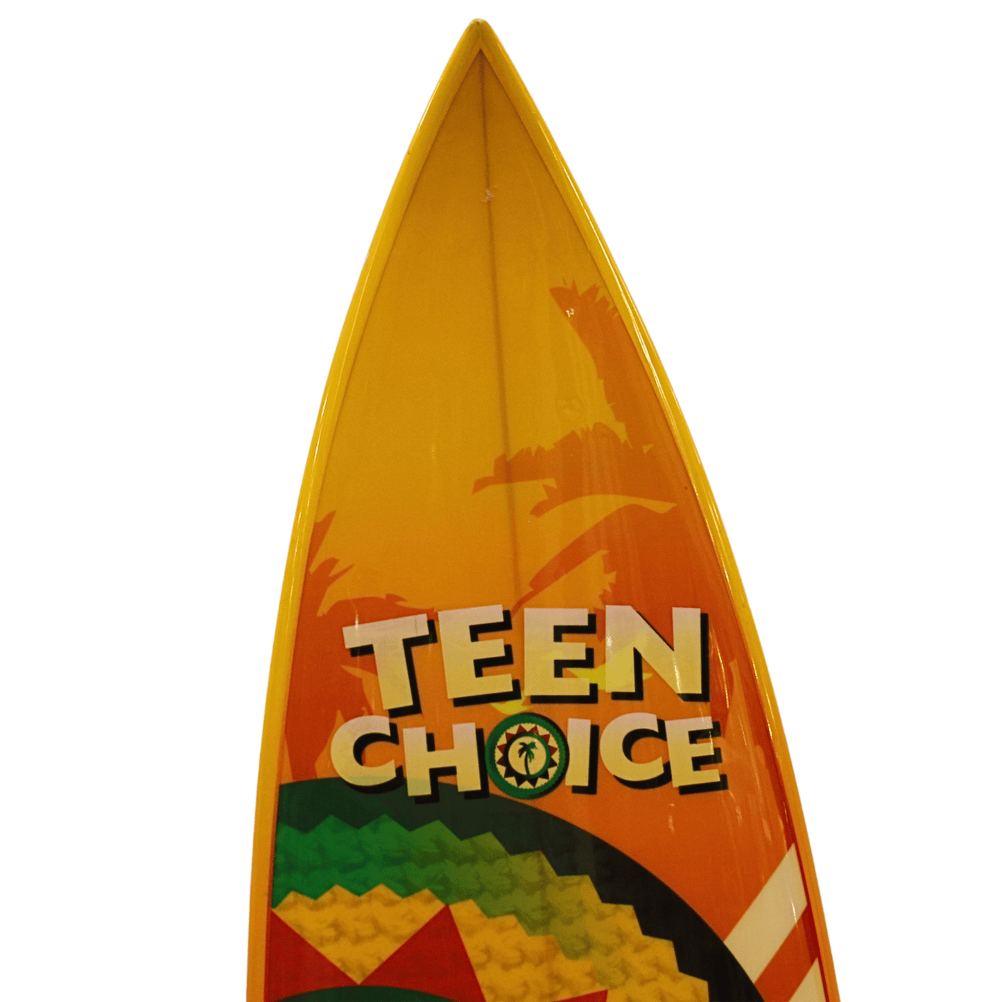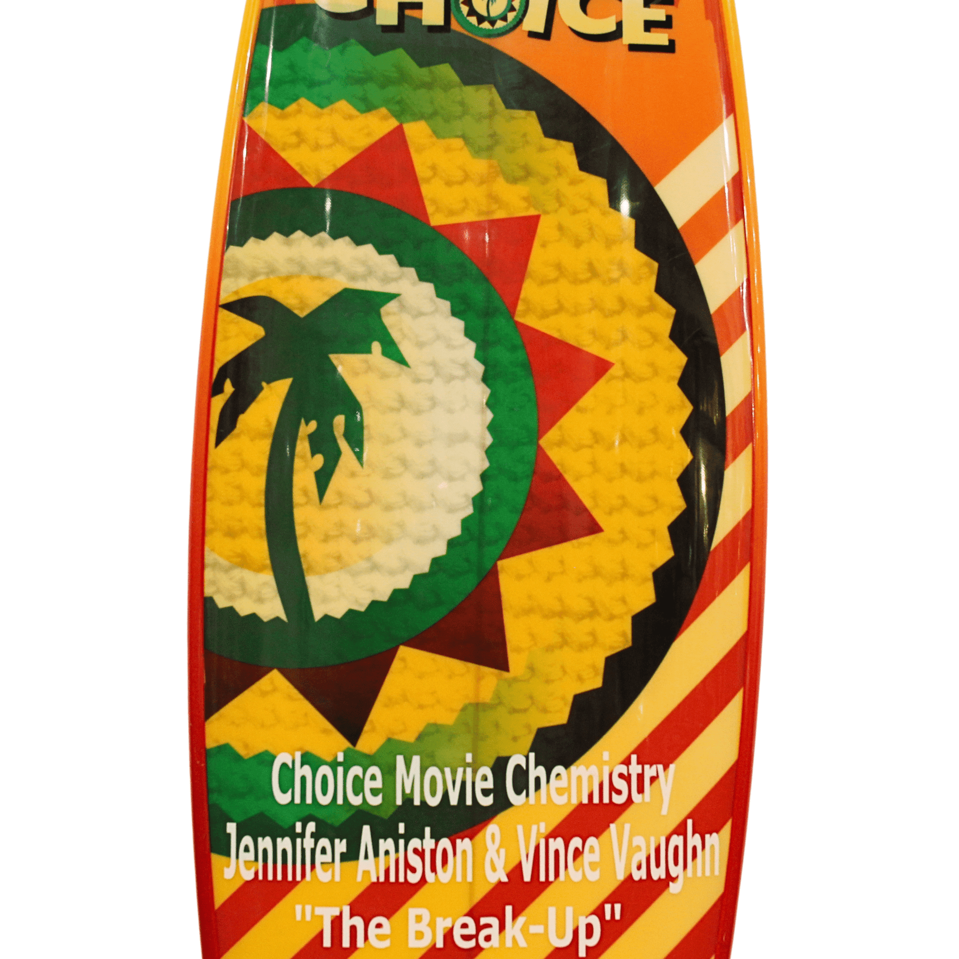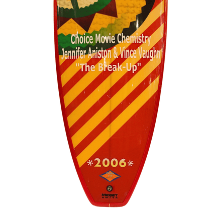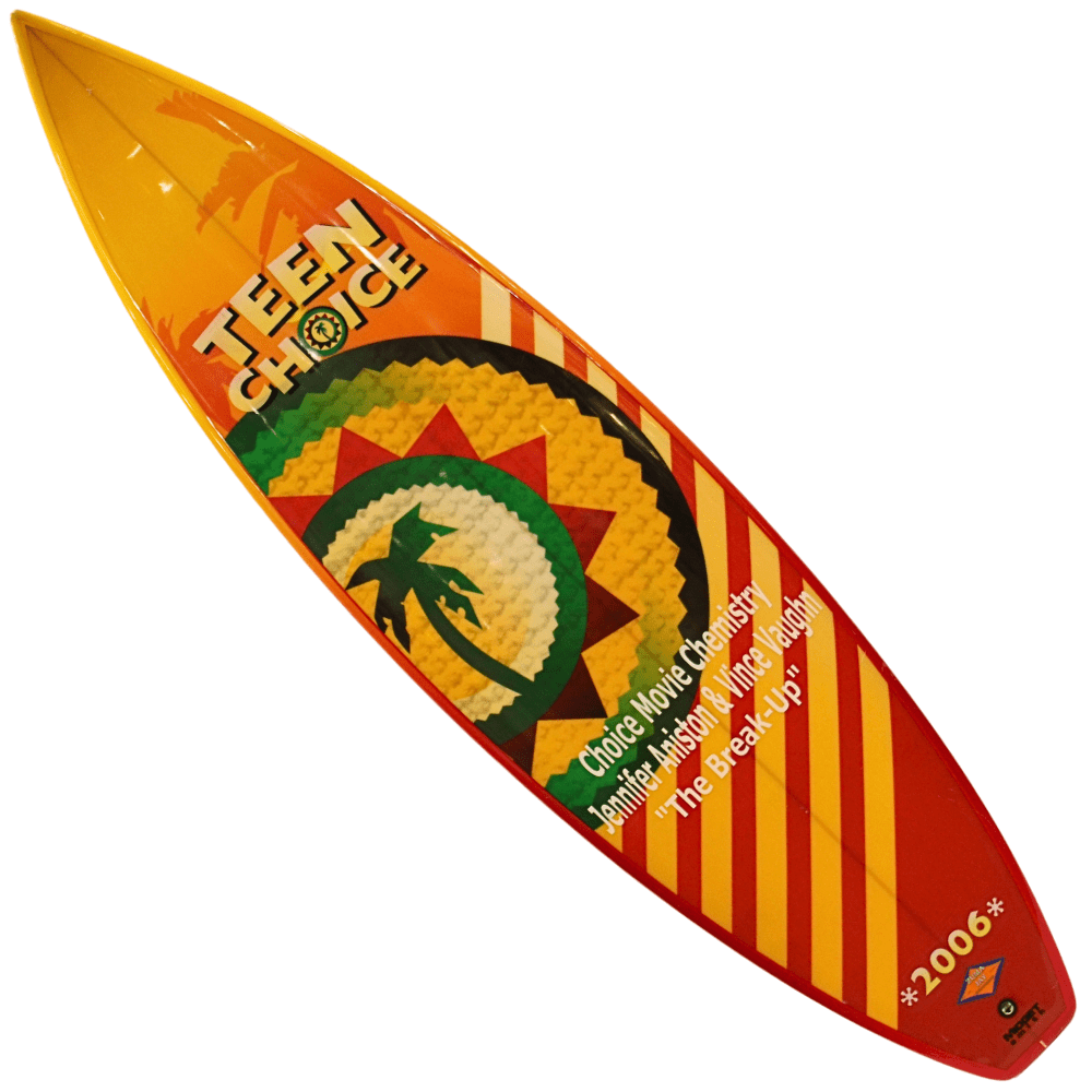 This is a genuine award from the 2006 Nickelodeon "Teen Choice Awards" that was awarded to Jennifer Aniston & Vince Vaughn for the category "Choice Movie Chemistry" in the film "The Breakup." As is the tradition for the teen choice awards the winners receive customized surfboards from the Malibu based Zuma Jay.