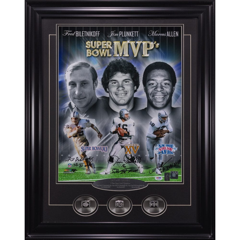 Show your Raider pride with this newly framed memorabilia featuring autographs from each of the teams Super Bowl MVP's; Fred Biletnikoff (SB XI), Jim Plunkett (SB XV), and Marcus Allen (SB XVIII). The autographed poster has been authenticated by PSA/DMA and includes a COA. Further enhancing the value of this piece are replicas of each Raiders Super Bowl Ring!