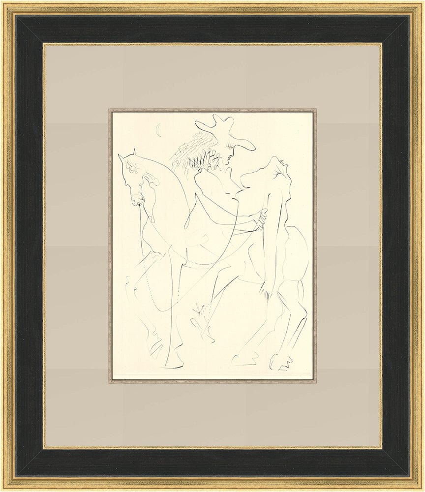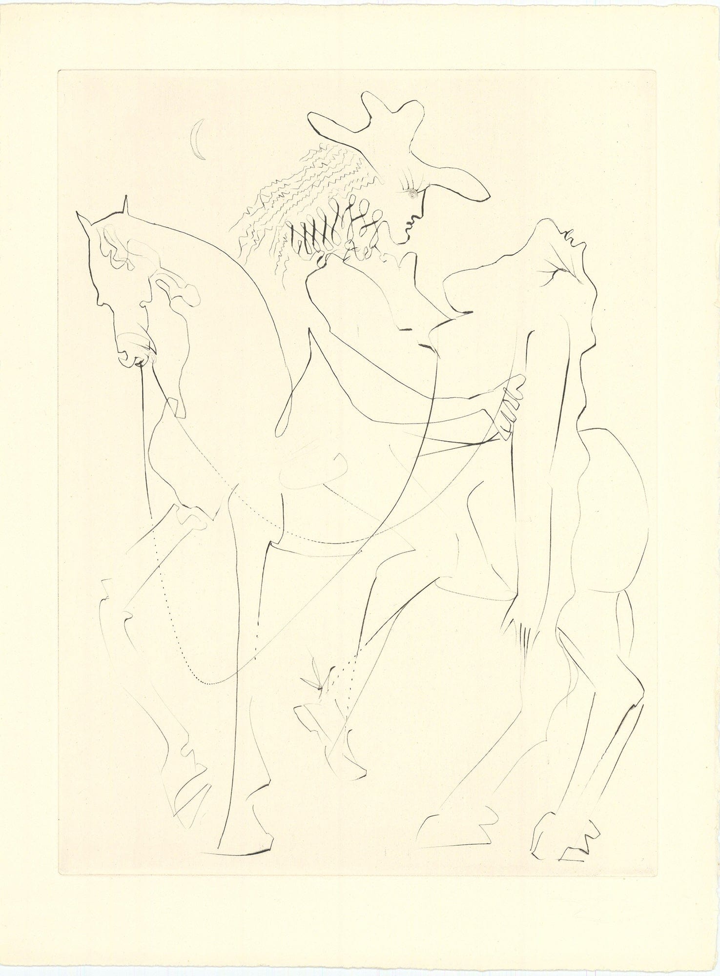 This graceful original etching is part of Salvador Dalí’s 1968 portfolio "Les Amours de Cassandre," a surrealist tribute to the romantic sonnets of French Renaissance poet Pierre de Ronsard. Published by Dalí's close collaborator Pierre Argillet, the work showcases the artist's mastery of the drypoint technique, utilizing fine, wispy lines to create spectral figures and dreamlike imagery directly on the copper plate. Unlike his heavier commercial prints, this piece captures the spontaneity and intimacy of a sketch, offering a rare blend of 16th-century classicism and 20th-century Surrealism.