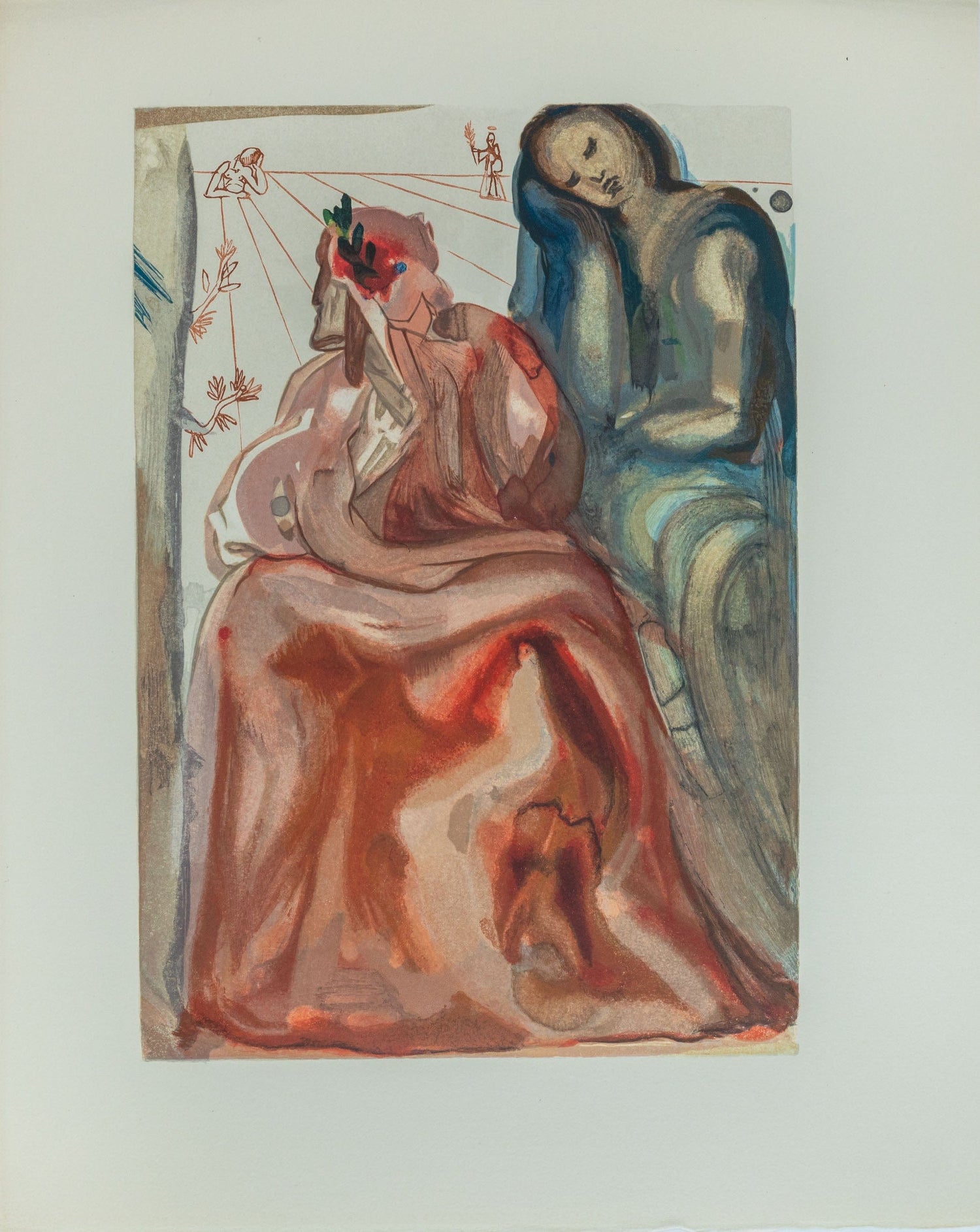 Original Wood Block Print from Salvador Dali's "Divine Comedy," a series of artworks made to illustrate the epic poem written by Dante Alighieri in the early 1300's. These works were commissioned in the 60's by the Italian Government to celebrate the 700th anniversary of Dante's birth. These are a fine entry point to the works of Salvador Dali as each is a fantastic example of the painstaking wood block printing process. Each color in the print required a separate, hand carved wooden printing plate, making each work a marvel of both artistic vision and skilled craftmanship.