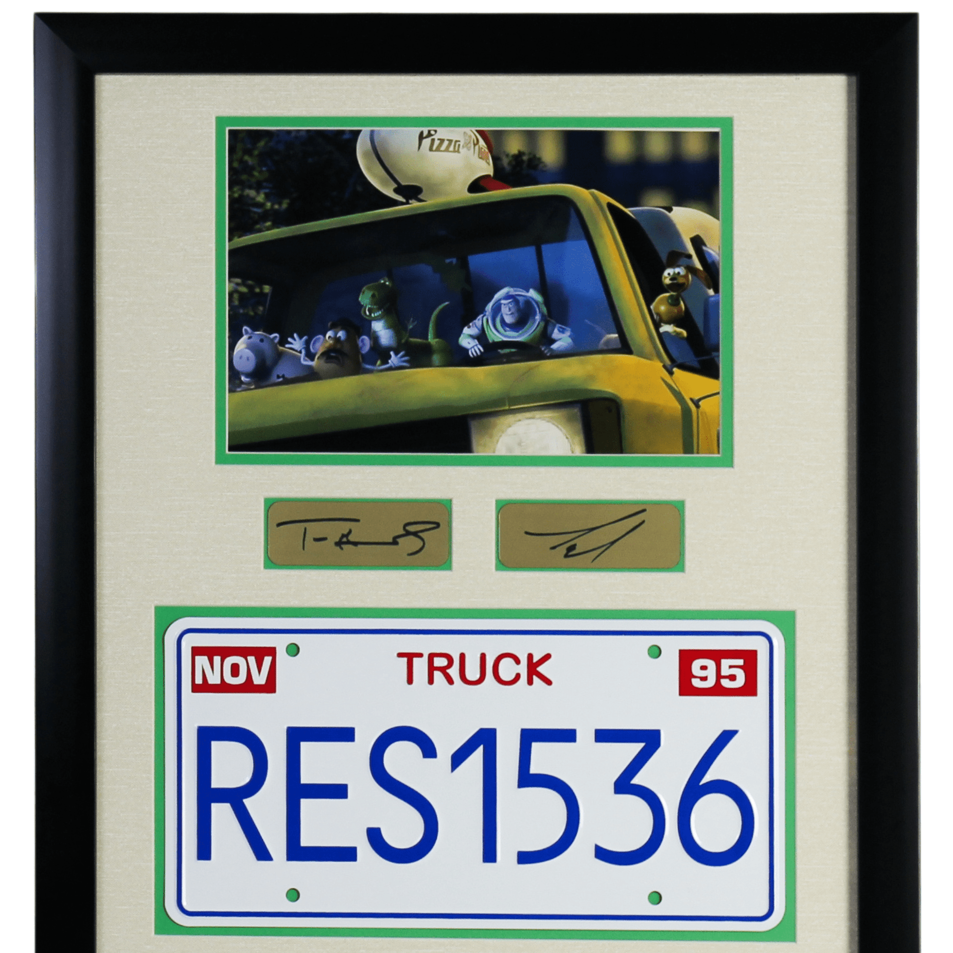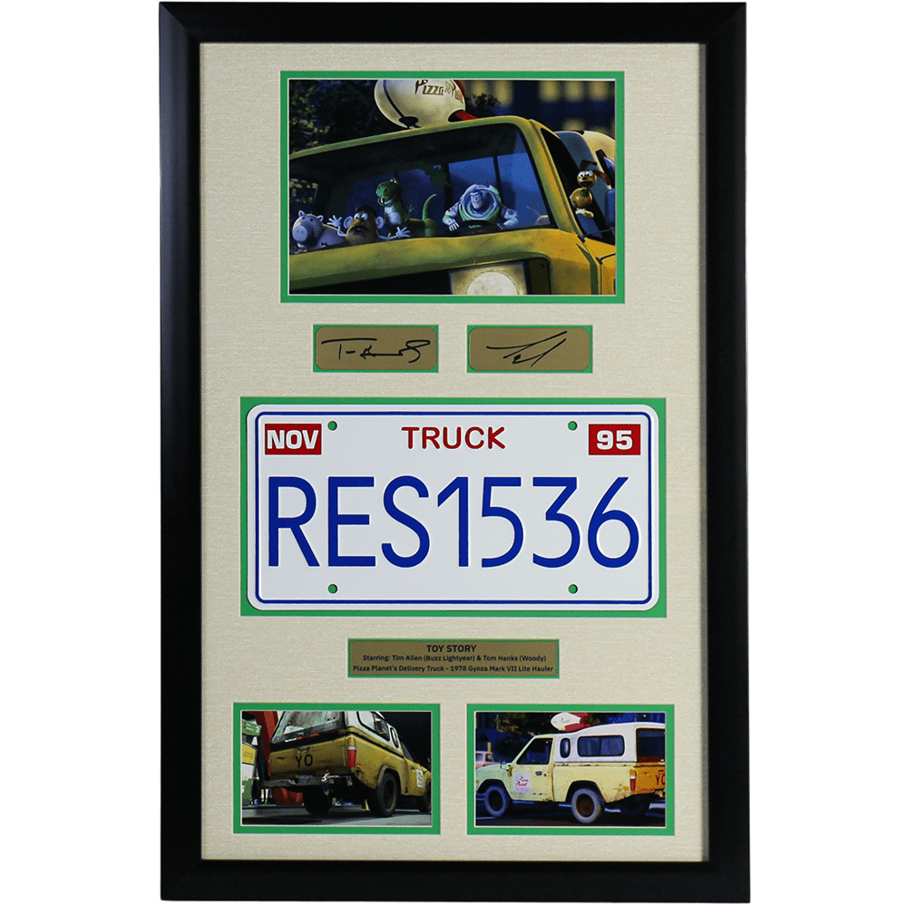 This collectible Toy Story Memorabilia includes vibrant photos, facsimile signatures of Tom Hanks and Tim Allen and a replica "Pizza Planets" delivery truck prop plate. Delight fans of this heartwarming story of friendship, loyalty, and adventure with this newly framed piece!