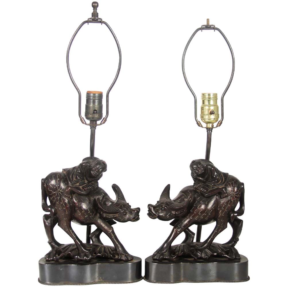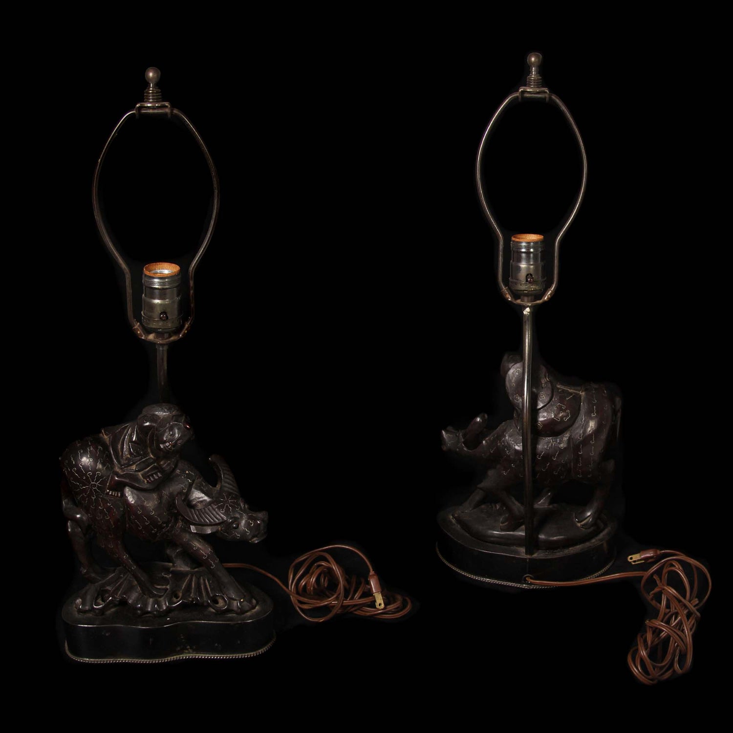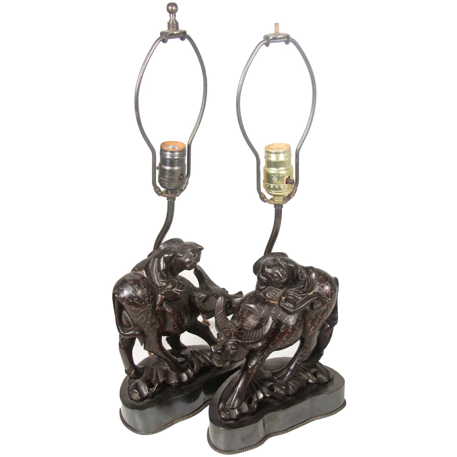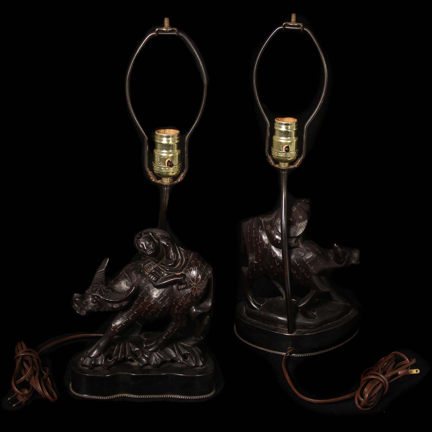 Unique set of lamps featuring a carving of a Water Buffalo with a rider. With their rustic and design, these lamps are an inspired choice for any discerning interior decorator.